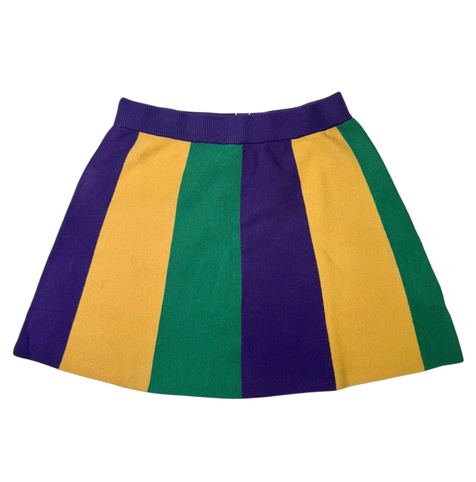 MARDI GRAS VERTICAL STRIPE SWEATER MINI SKIRT. ALSO AVAILABLE IN-STORE.