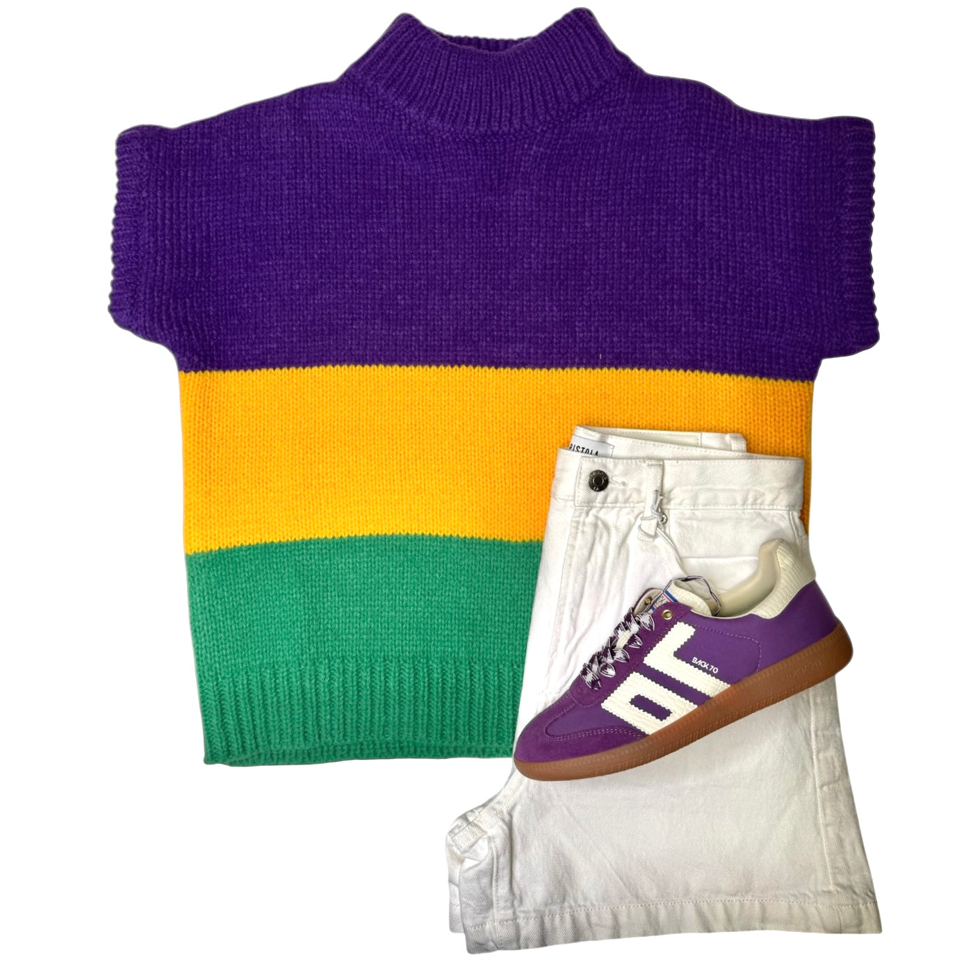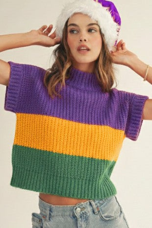Sleeveless mock neck sweater with Mardi Gras color blocking.