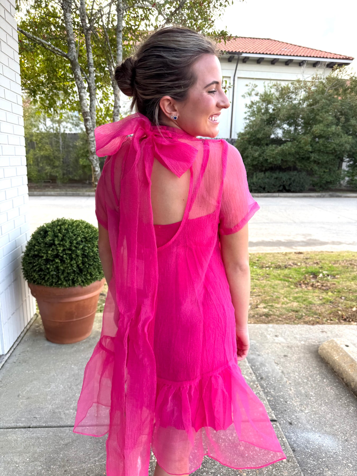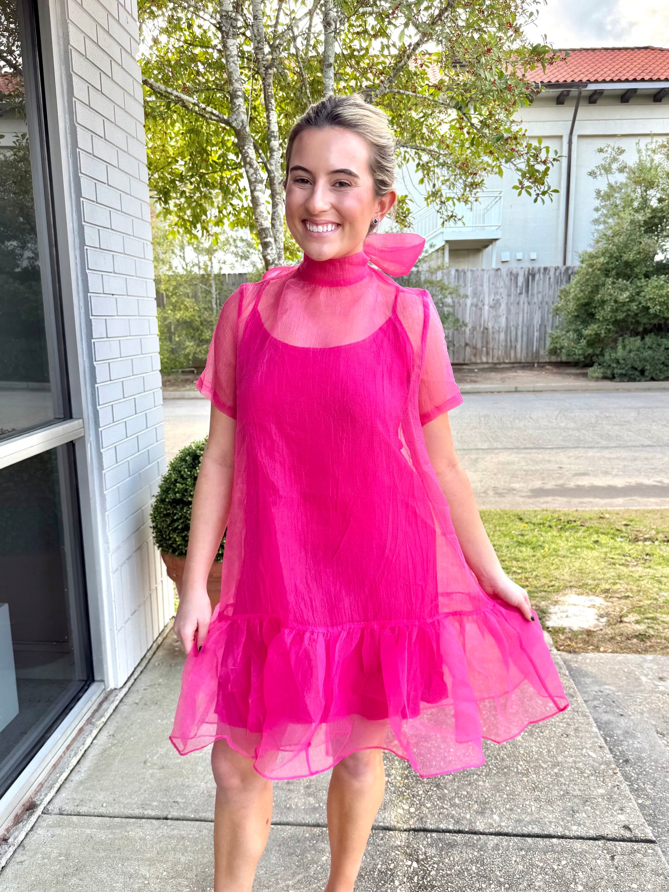 Pink organza dress featuring a mock bow back. Perfect for weddings, bridal showers, and brunches!