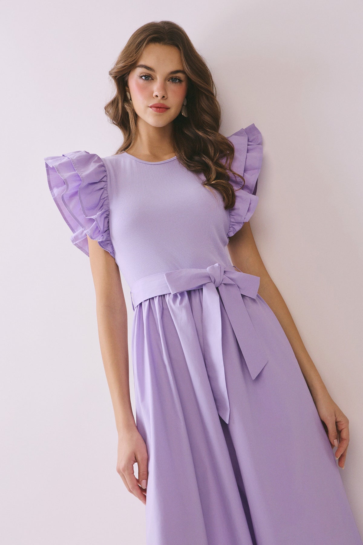 A sleeveless midi dress featuring dramatic double-layered ruffle shoulders. The fitted bodice contrasts with a full A-line skirt cinched at the waist with a wide self-tie sash and side seam pockets. Perfect for a Mardi Gras brunch! Also, available in-store.
