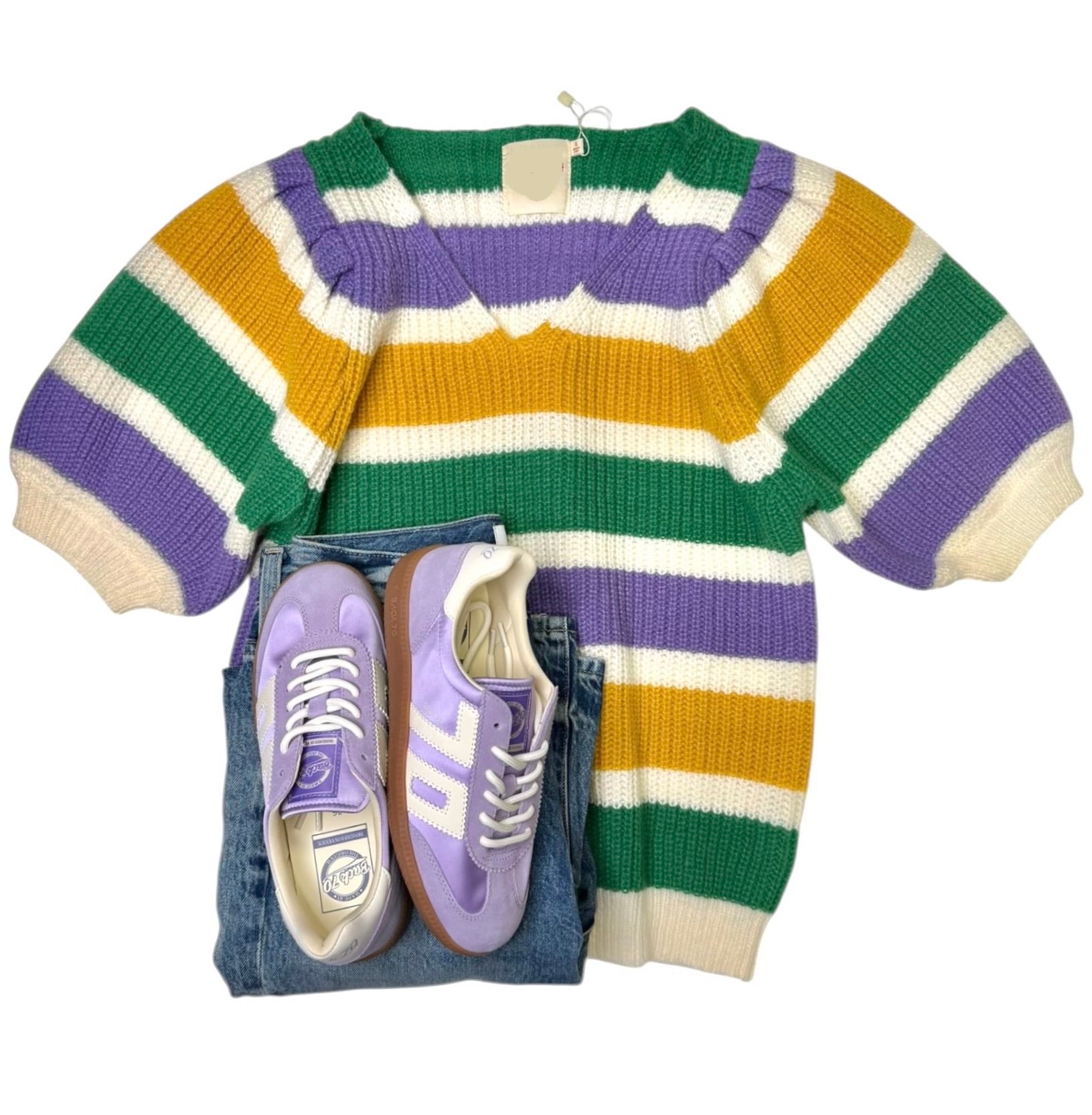Knit short sleeve sweater with contrast stripes. Perfect for the pardi!