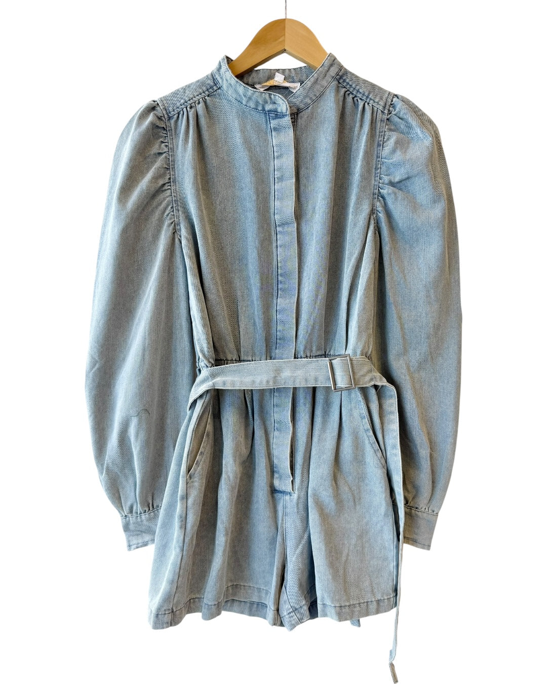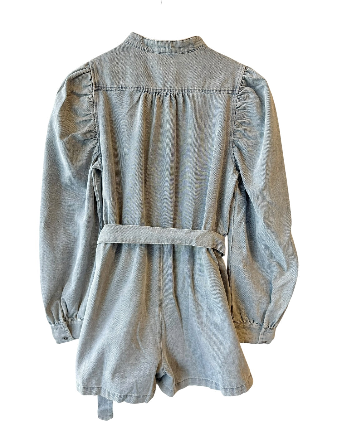 Light denim, long puff sleeve belted button down romper. Made of 100% cotton. Fitting slightly big. Also available in store!