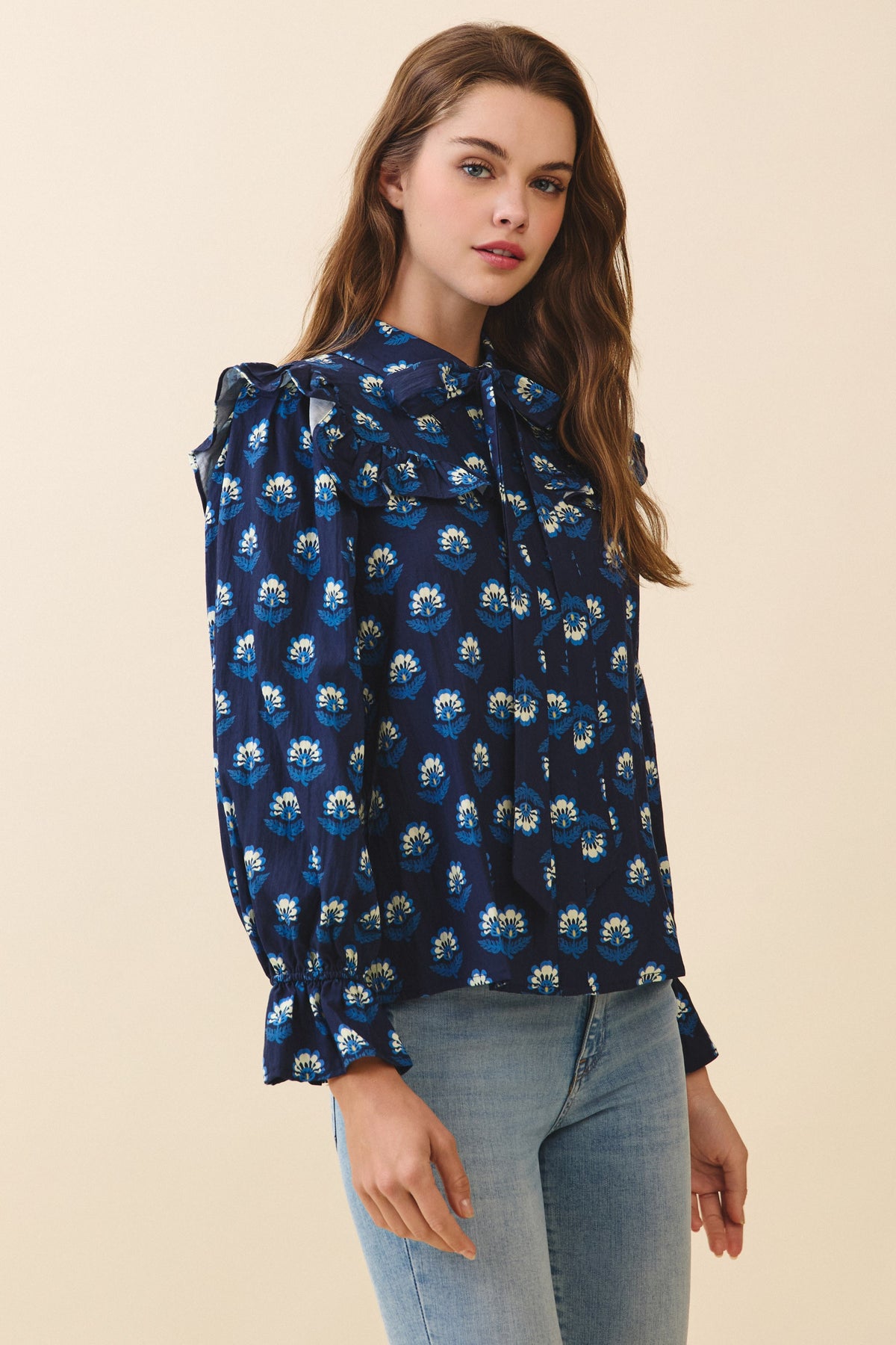 A floral print blouse featuring a ruffled yoke detail and tie-neck bow. Designed with long puff sleeves finished with ruffled cuffs and hidden button-front closure.