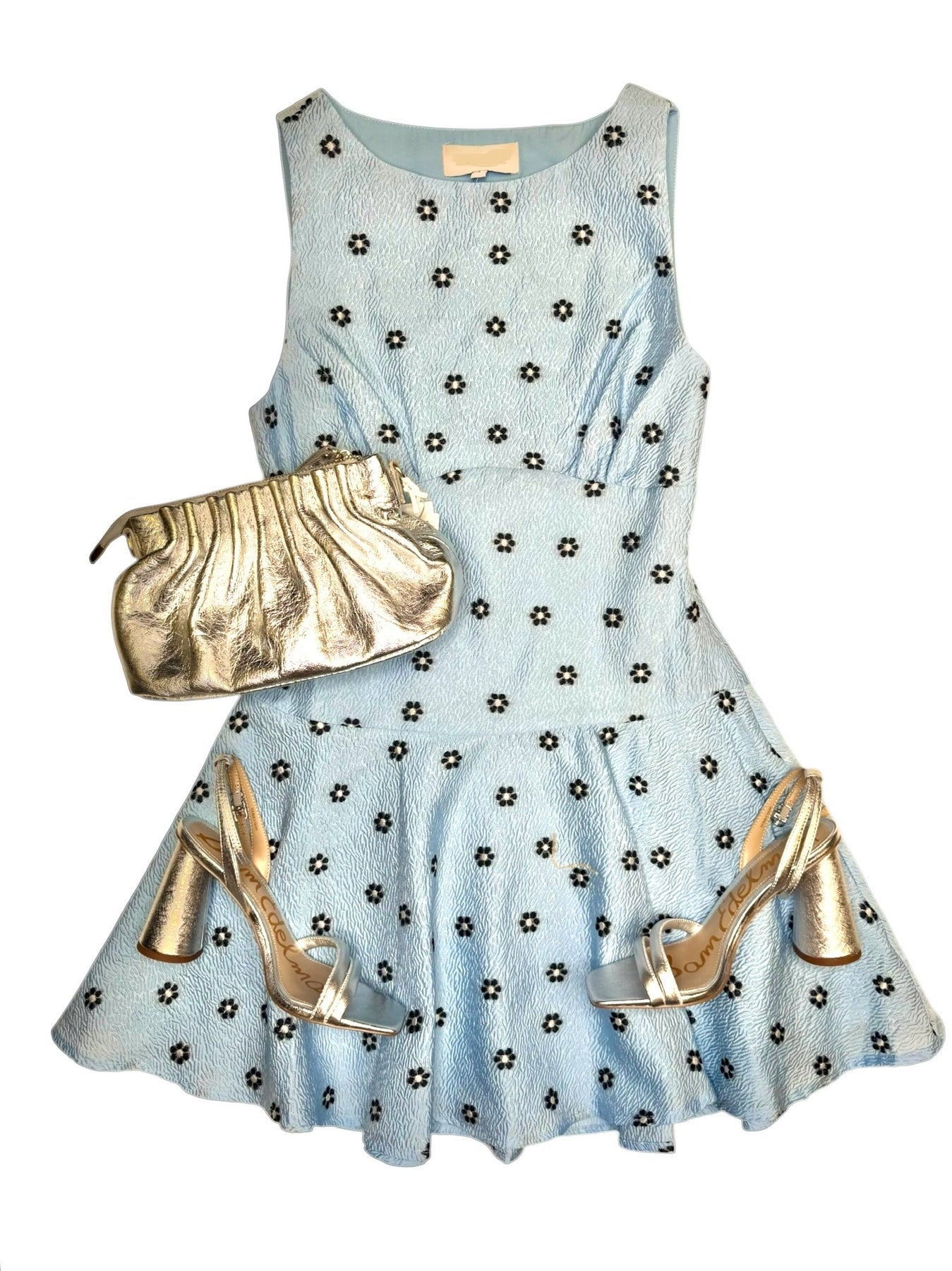 Light blue textured sleeveless mini dress featuring tonal floral detailing and a flared skirt. Designed for a flattering fit-and-flare shape, perfect for special occasions or holiday events. Also, available in-store.