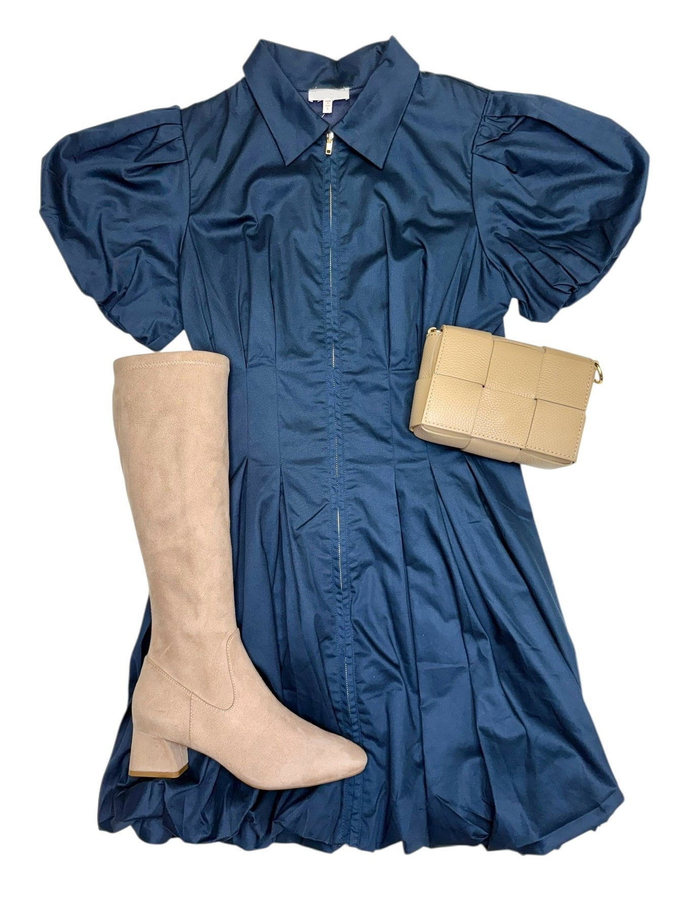 A fit-and-flare dress featuring a zippered front, collared neck, short bubble sleeves, and a matching bubble hem. Easy to dress down with a sneaker or wear a flat to dress it up.