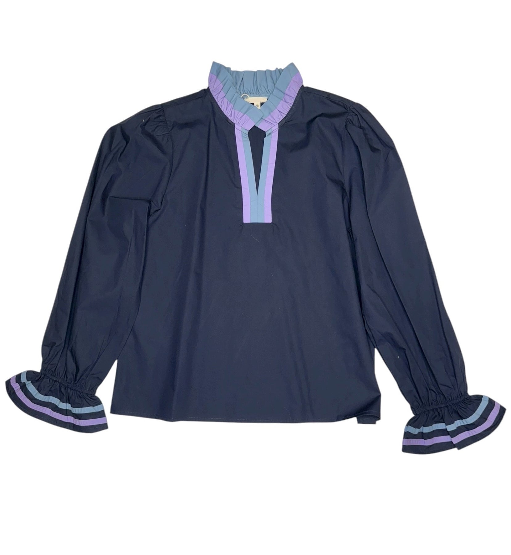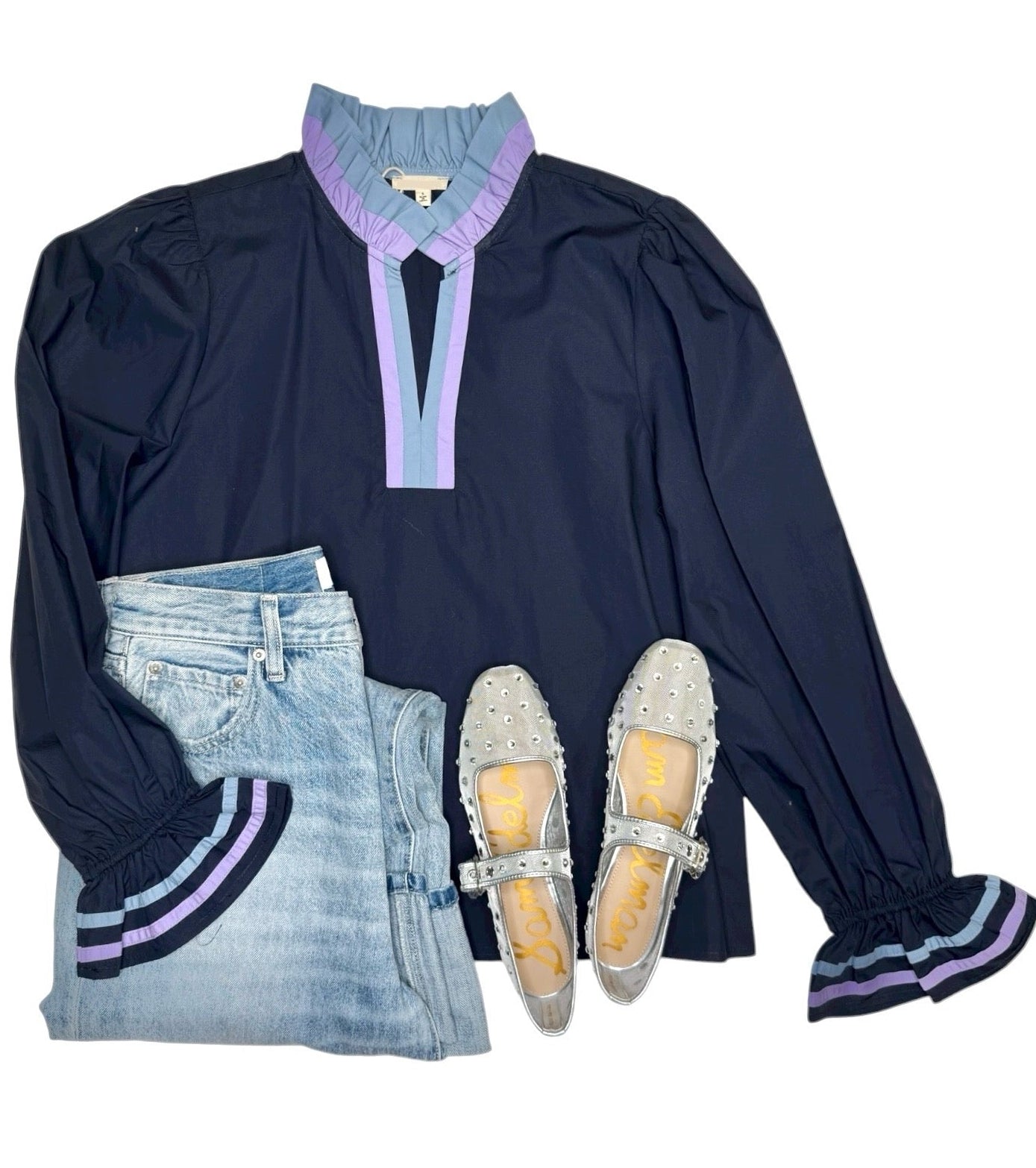 Crisp poplin blouse with a ruffled neckline and statement sleeve cuffs, accented with lavender and periwinkle trim. A polished pop of color for work or weekend wear. Also, available in-store.