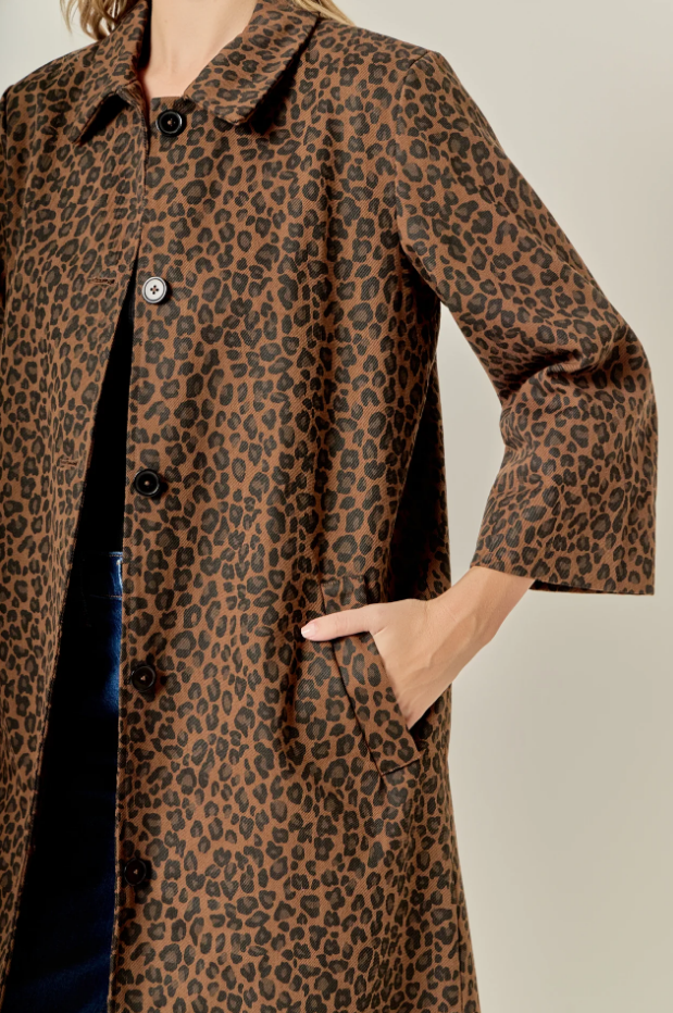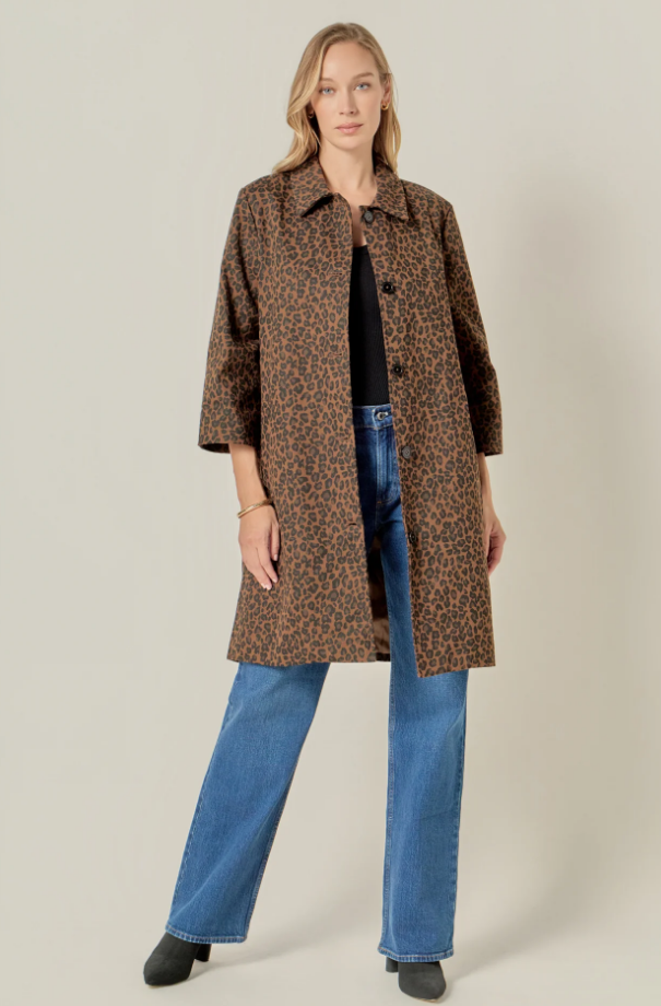 Make a bold statement with our Animal Print Trench Coat, the perfect blend of sophistication and edge. Designed with a classic collar, button-front closure, and functional side pockets, this coat combines timeless tailoring with a modern, fashion-forward print. The lightweight yet structured fabric makes it ideal for layering season after season.