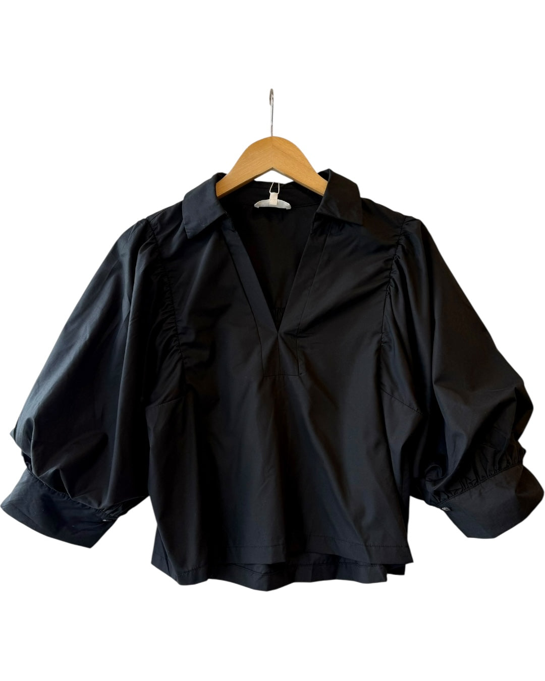 Black, vneck collared top with three quarter puff sleeves. Made of 80% polyester and 20% cotton. Fitting true to size, also available in store!
