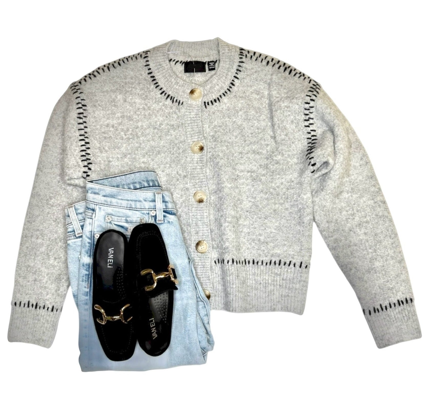 Button-front cardigan with contrast whipstitch detailing along the seams. Designed with a slightly cropped fit and ribbed cuffs for a modern twist on a classic knit.