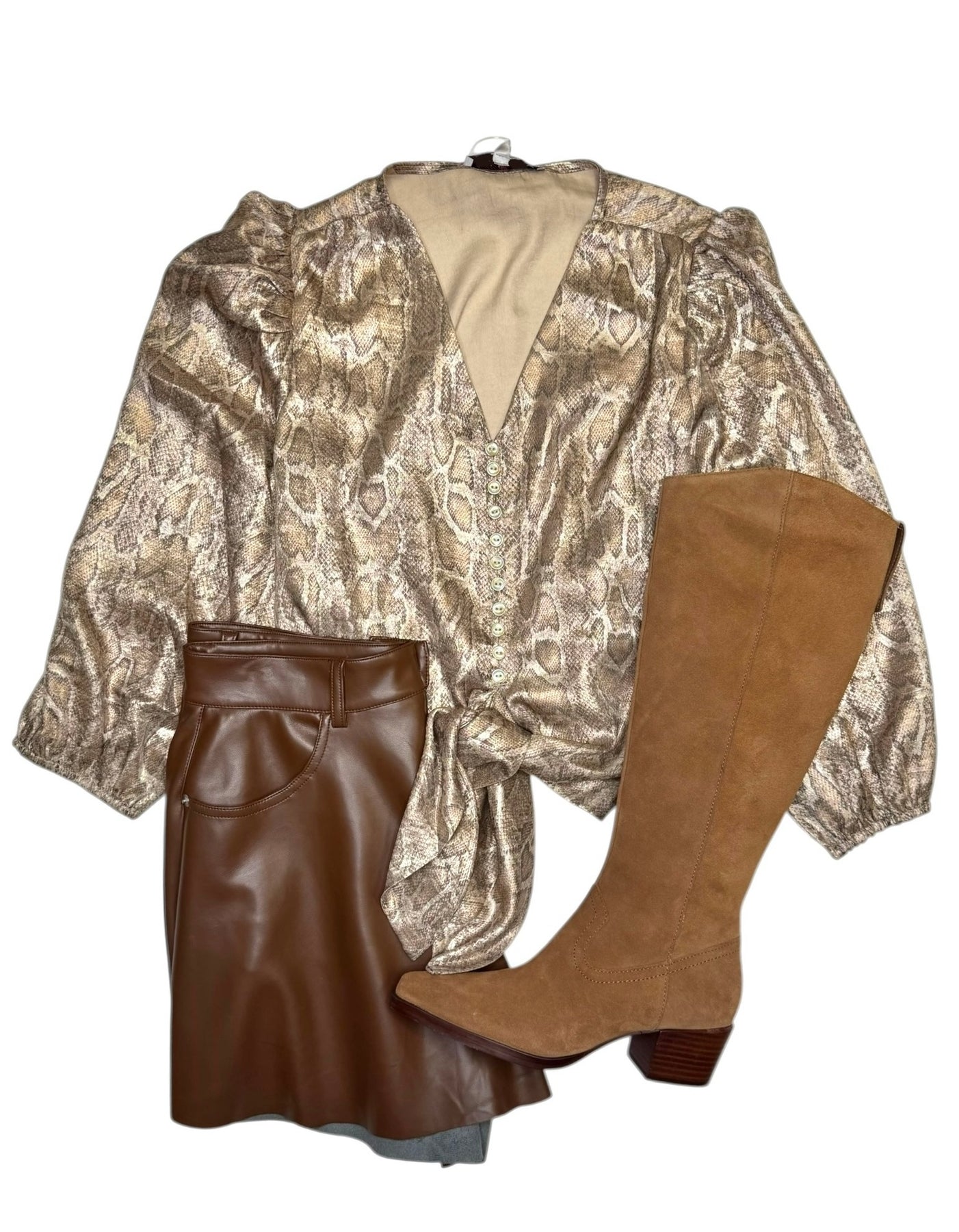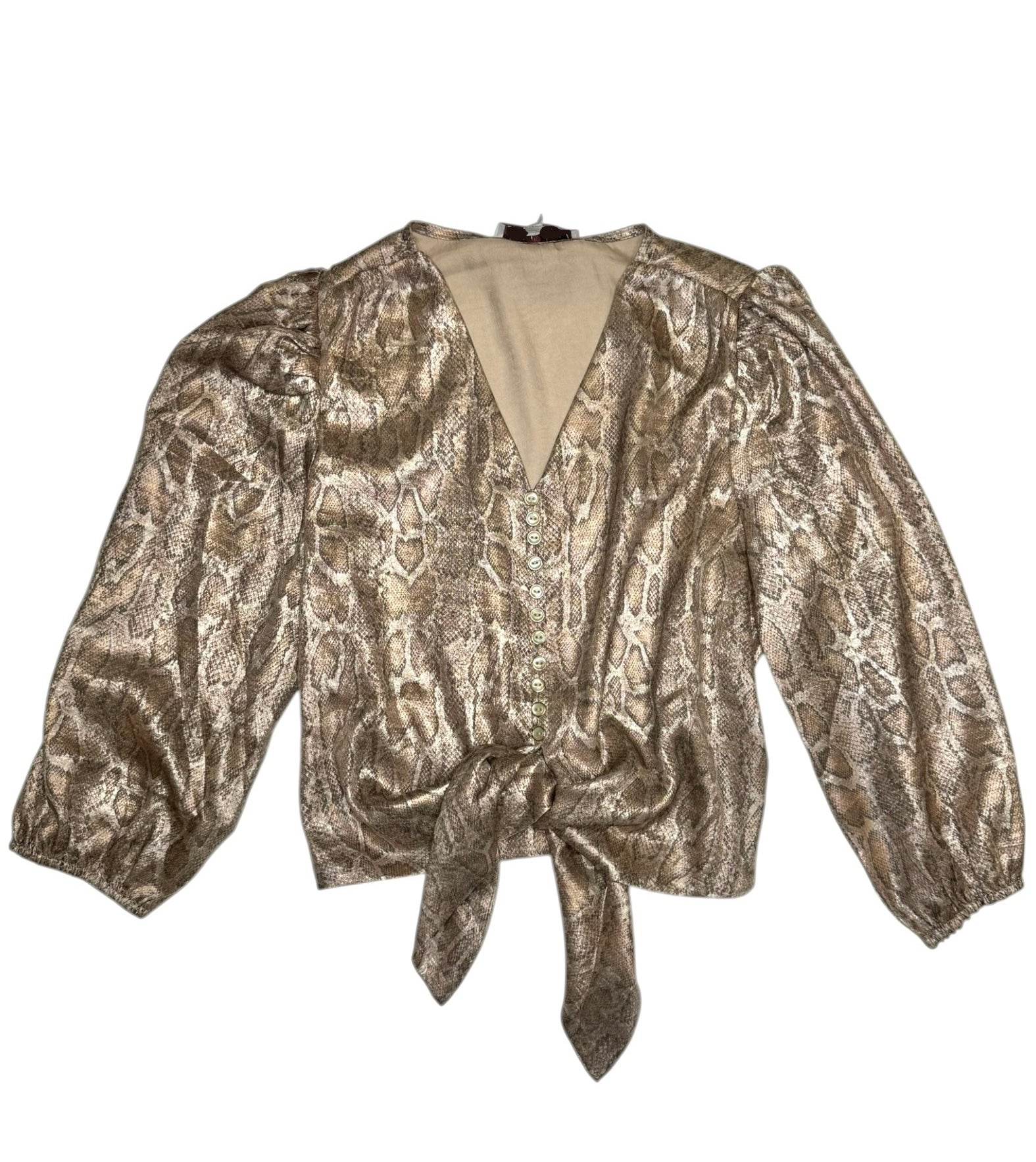 Metallic snake print top with quarter length sleeves feautring irredesient buttons and a knot tie bottom. Pair with denim for a casual look or wear with leather bottoms or trousers paired with boots or heels for a dressier look. Also, available in-store.