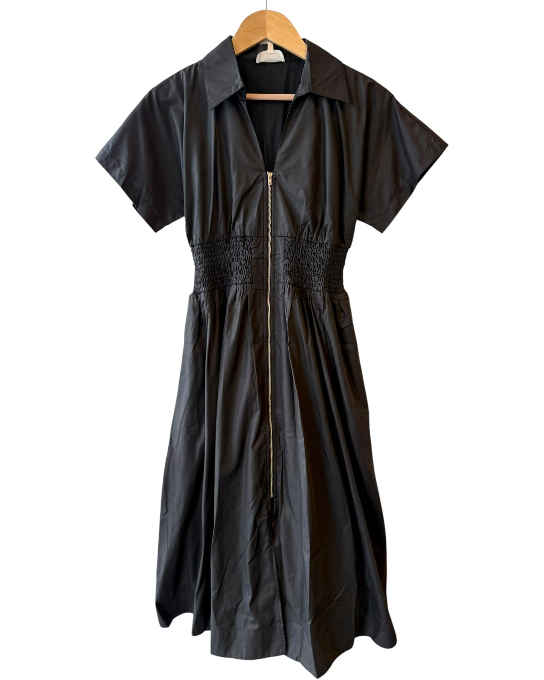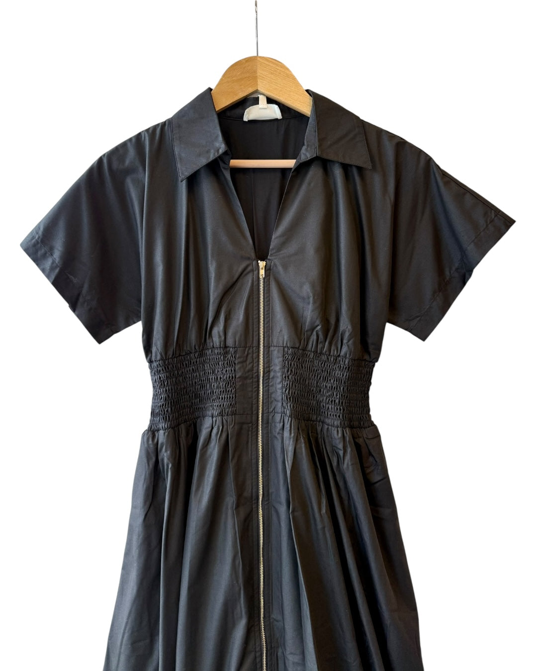 Black short sleeve collared midi dress. Features a gold zipper closure in front and a cinched waistline. Fully lined. 80% polyester 20% cotton and lining is 100% rayon. Fitting true to size, also available in store!
