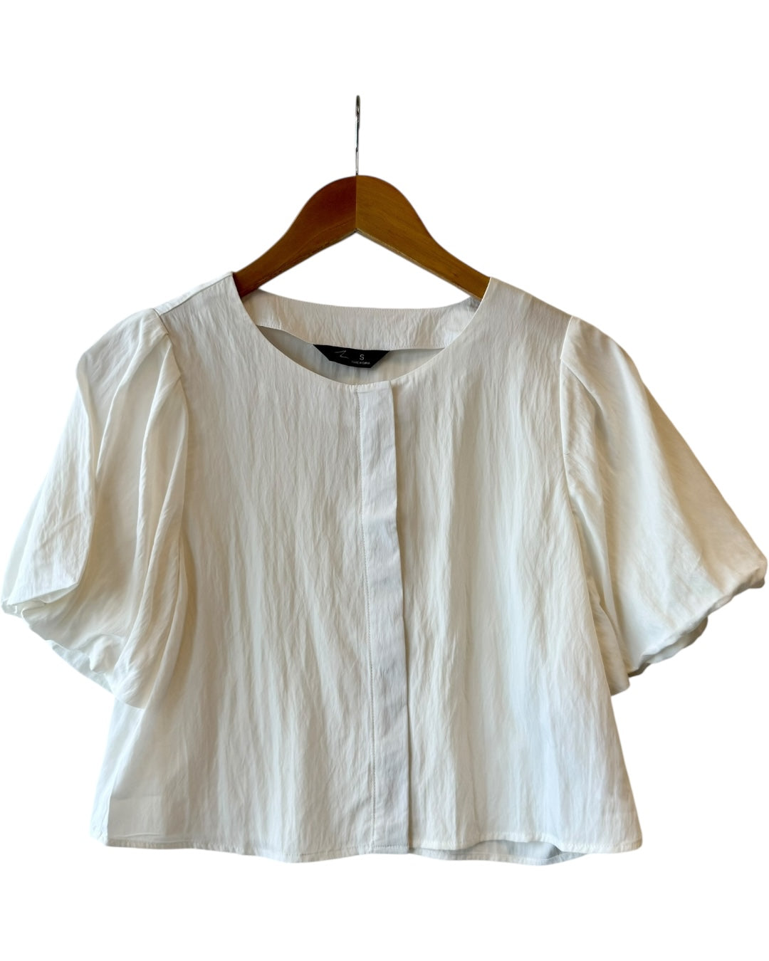 Round neck, puff sleeve top with hidden buttons down the front. Available in Black, white, and brown. 75% rayon and 25% nylon. Fitting true to size, also available in store!
