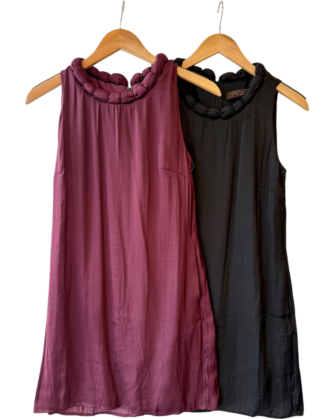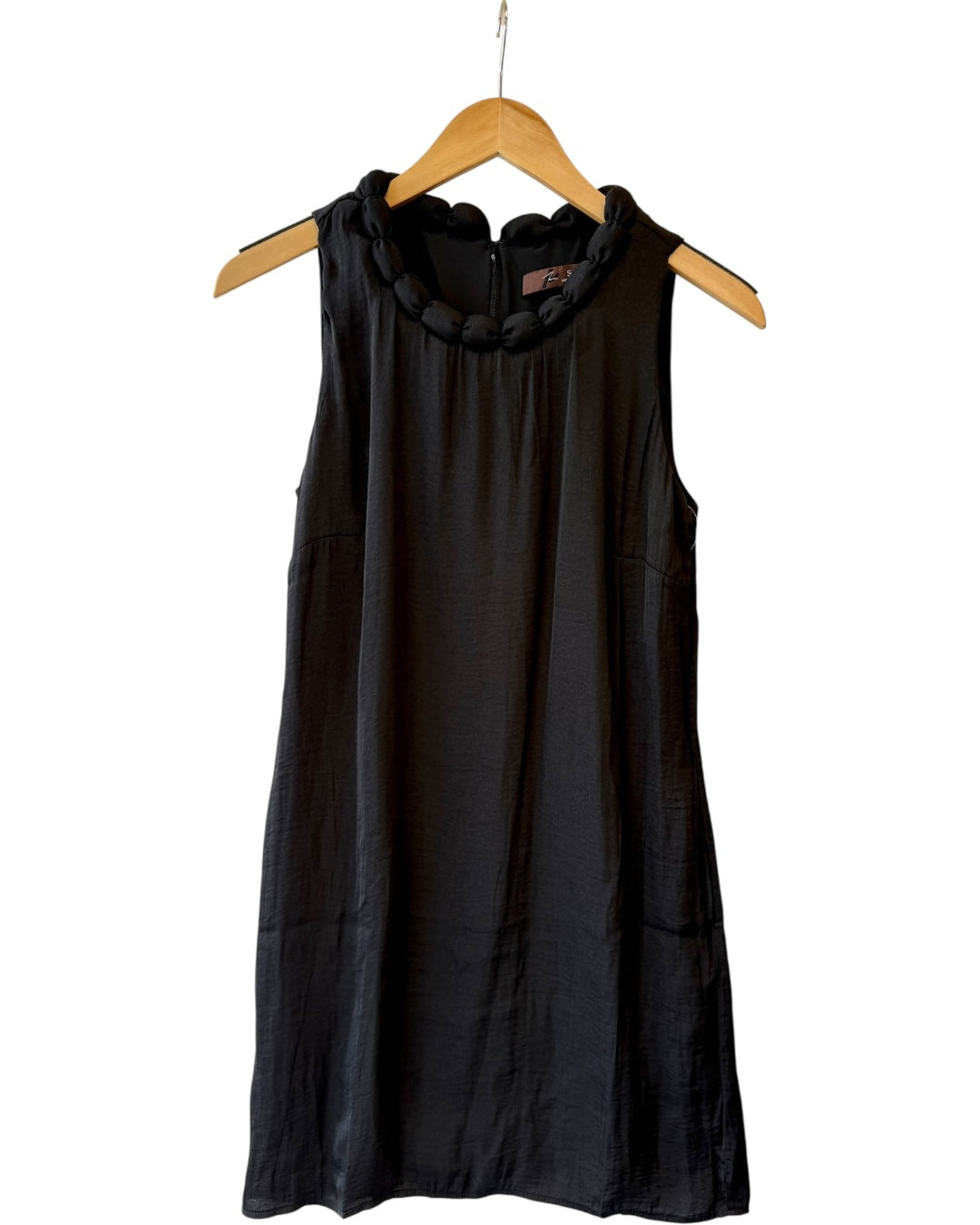 Flowy mini dress featuring a round braided style neckline. Has two size pockets. Hidden zipper down the back. Fully lined. Made of 100% polyester. Fitting true to size, also available in store! s