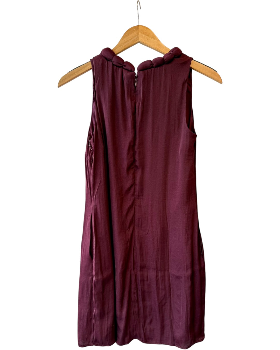 Flowy mini dress featuring a round braided style neckline. Has two size pockets. Hidden zipper down the back. Fully lined. Made of 100% polyester. Fitting true to size, also available in store! s