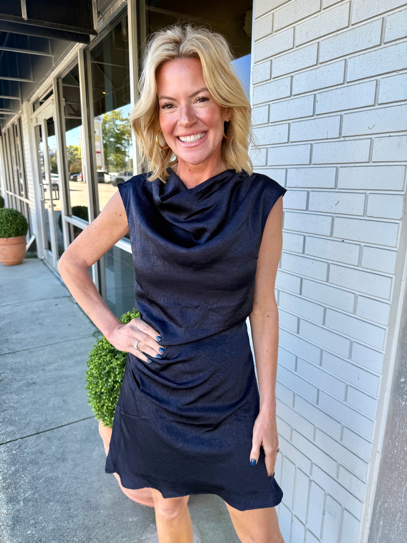 Sleeveless satin draped neck mini dress. Also available in-store.