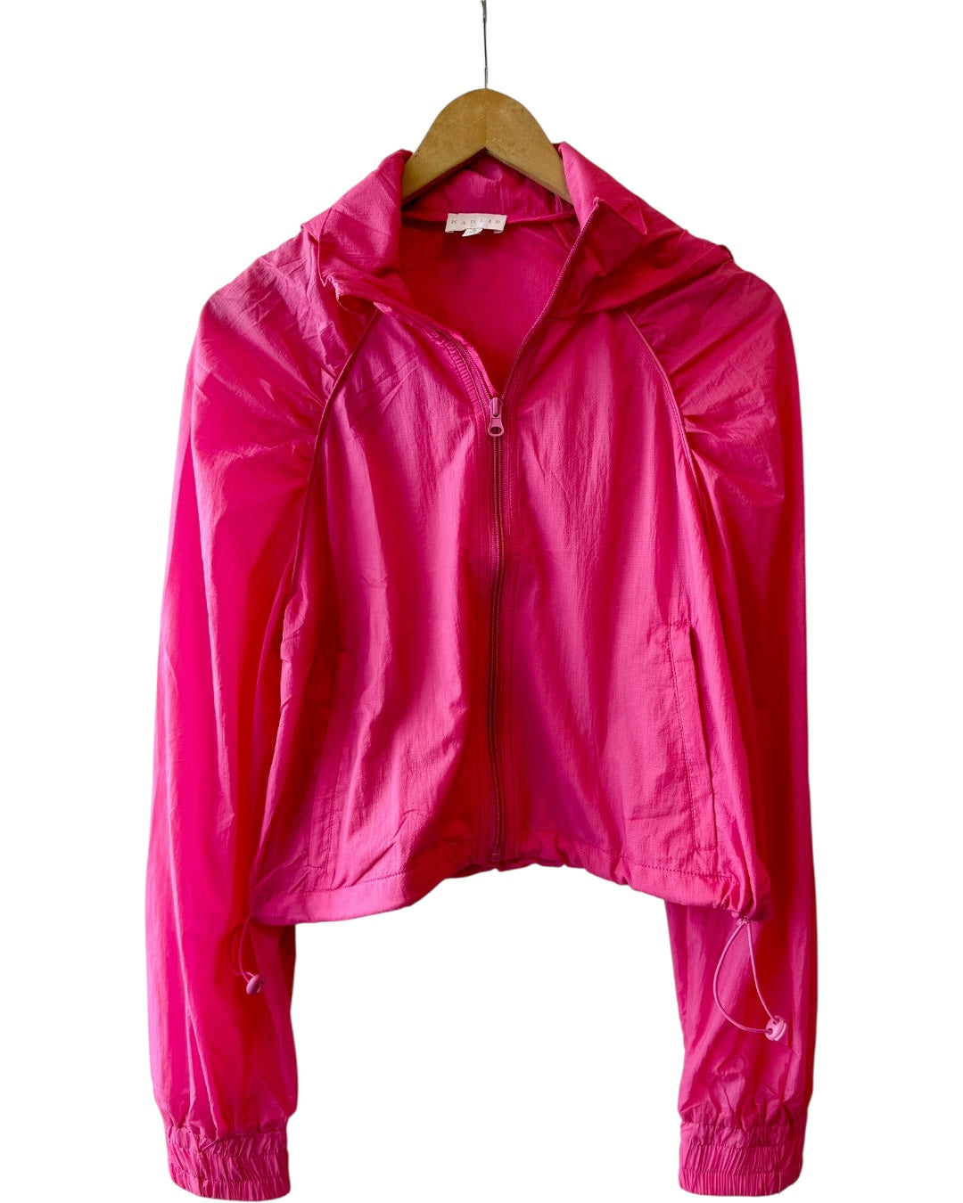Windbreaker hooded zip up jacket. Has two side pockets and a cinched bottom. Available in bright pink and black. 100% nylon and lining is 100% polyester. Fitting true to size, also available in store!