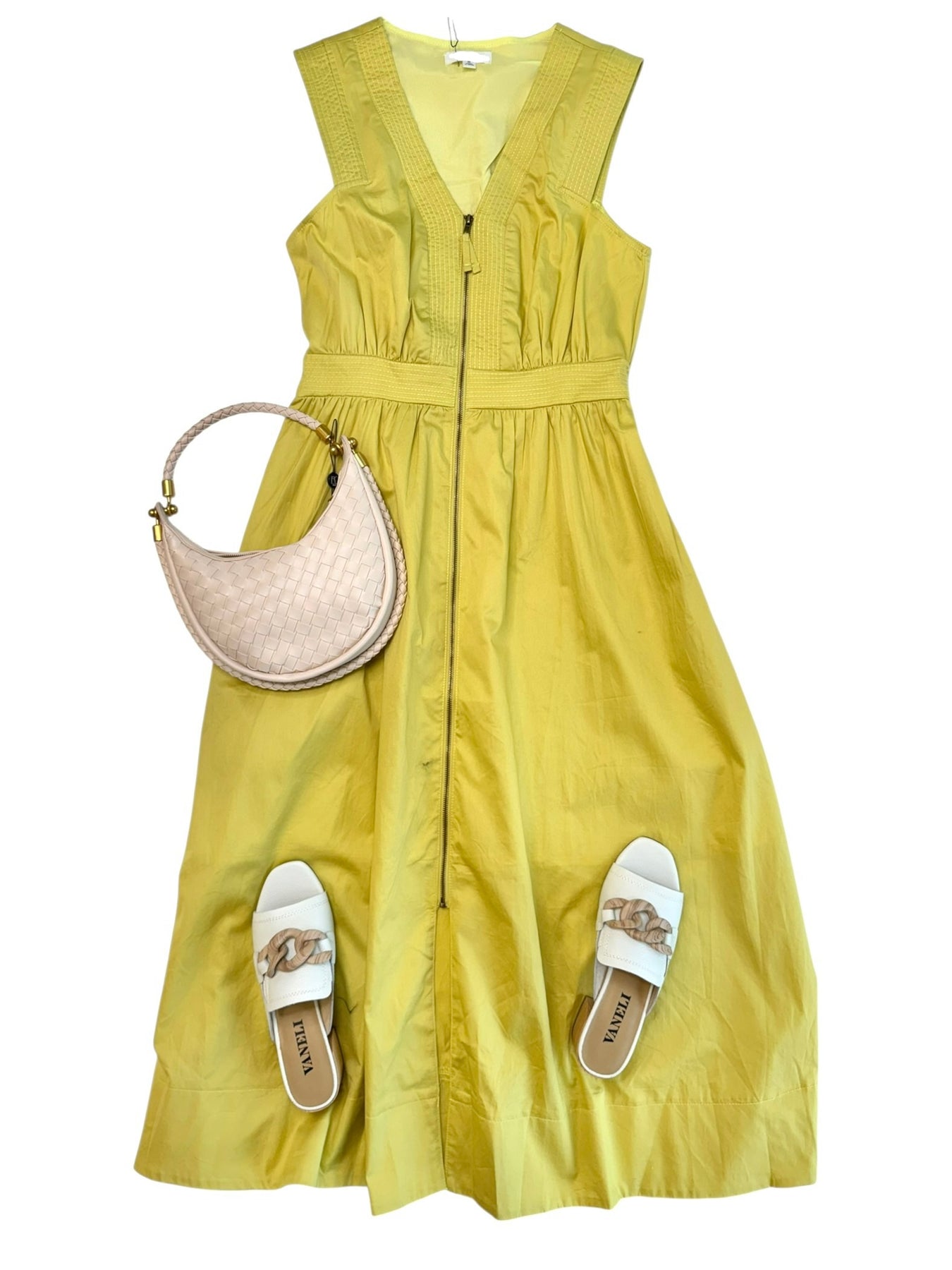 Sleeveless zipper front midi dress, v-neck, pockets, and smocked elastic on back.
