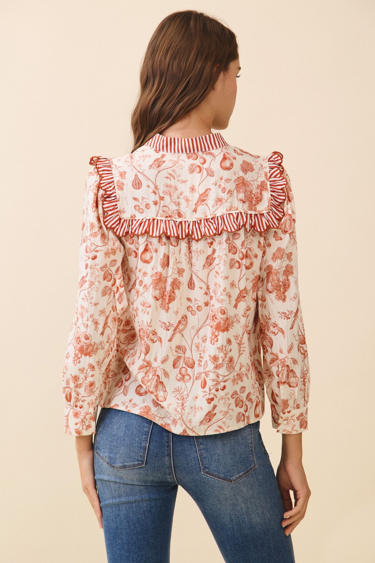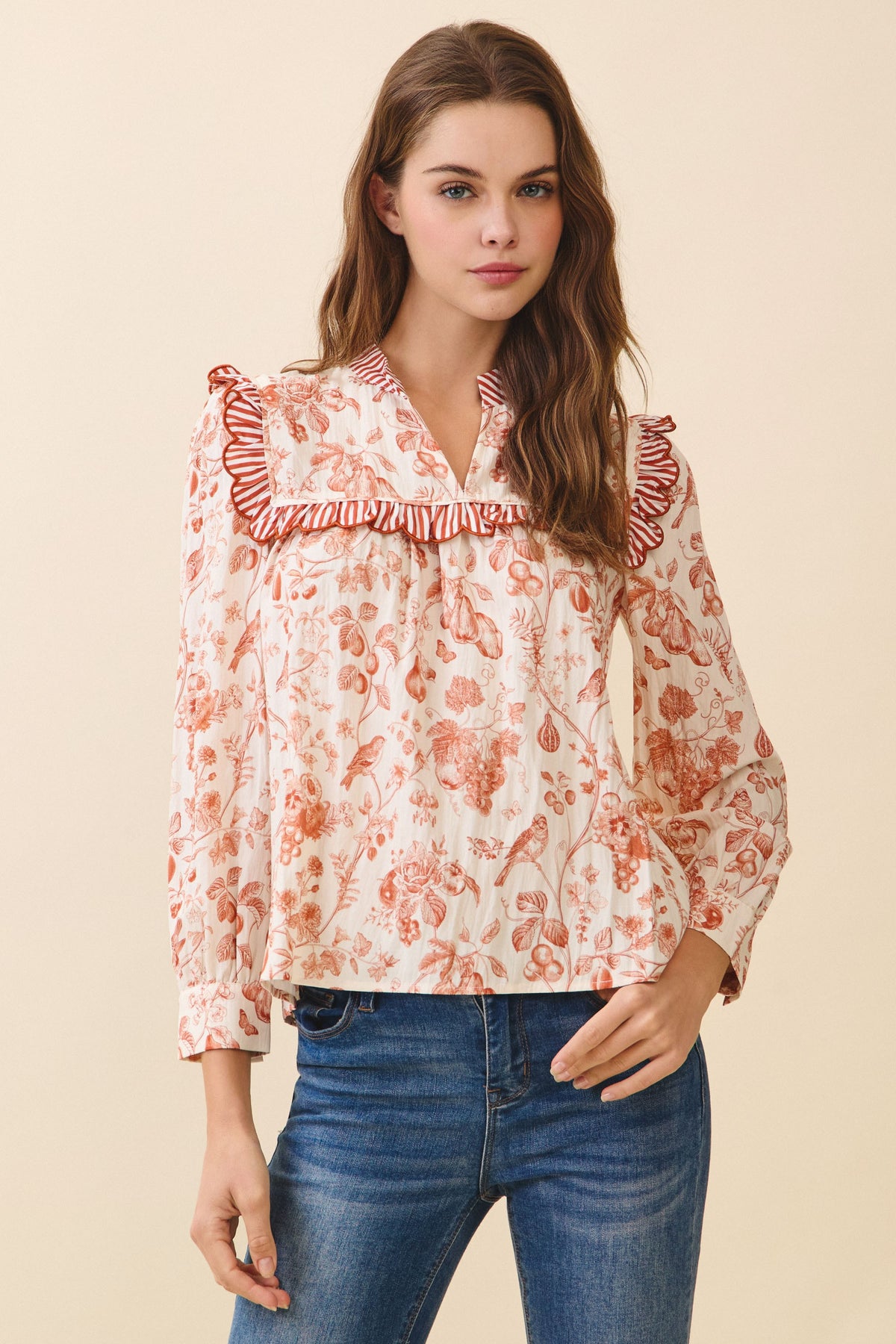 A floral print blouse featuring a striped ruffle yoke detail with matching collar trim. Designed with long sleeves, buttoned cuffs, and a relaxed silhouette.