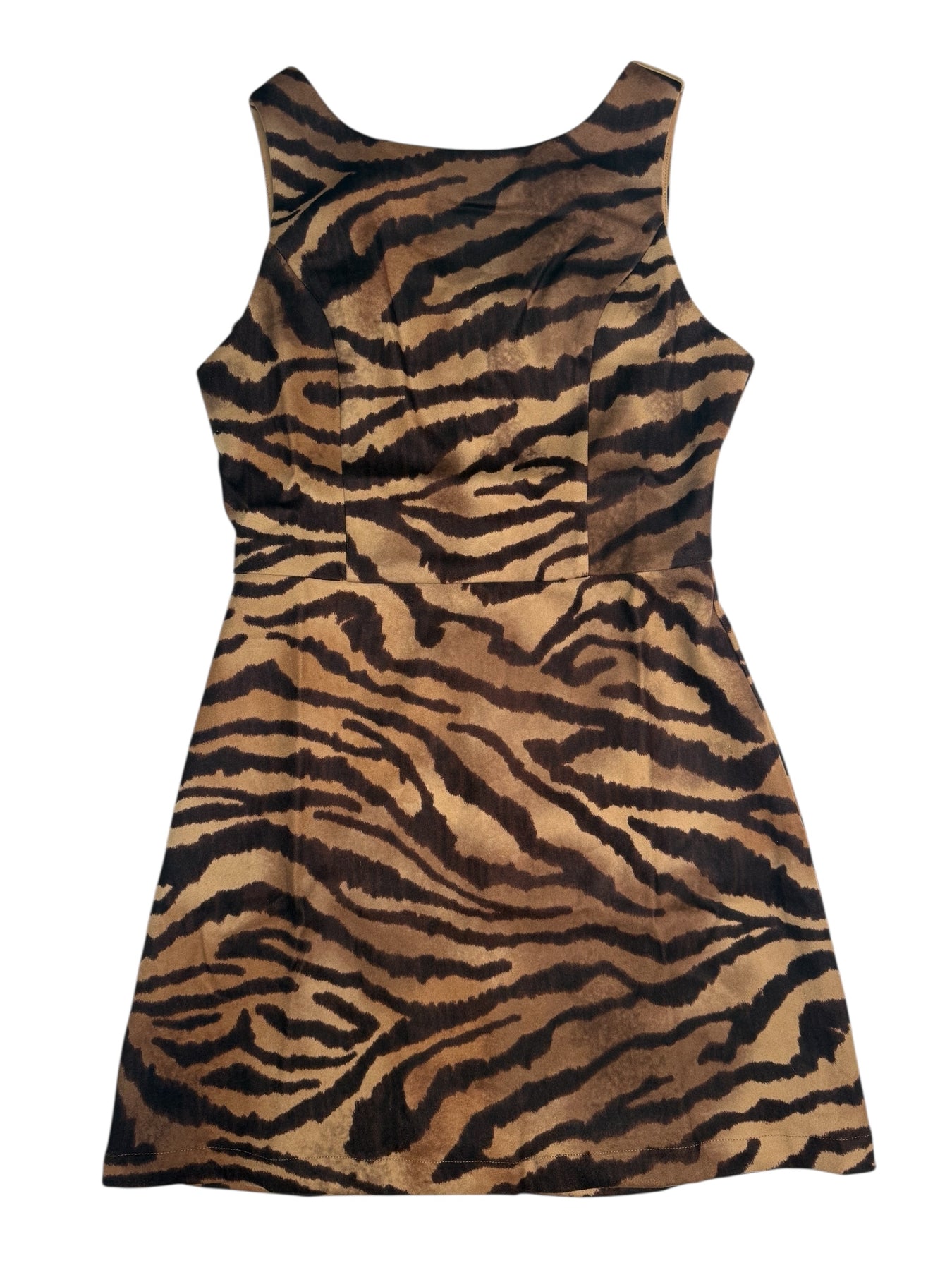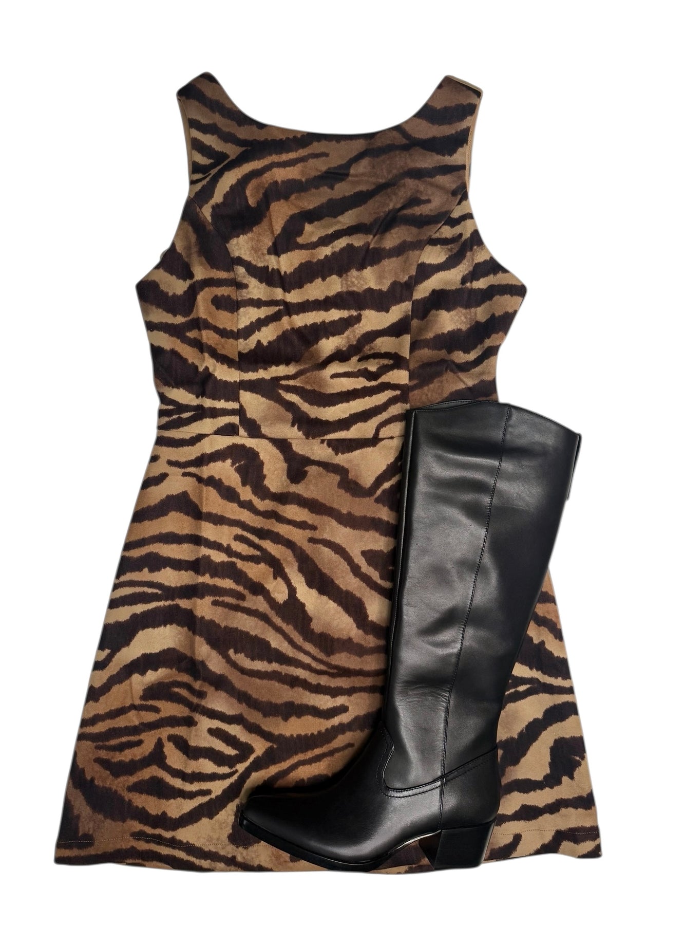 A sleeveless mini dress featuring a bold tiger print pattern and flattering fitted silhouette. Designed with a structured shape and soft suede-like texture for a sleek yet wearable finish. Also, available in-store.