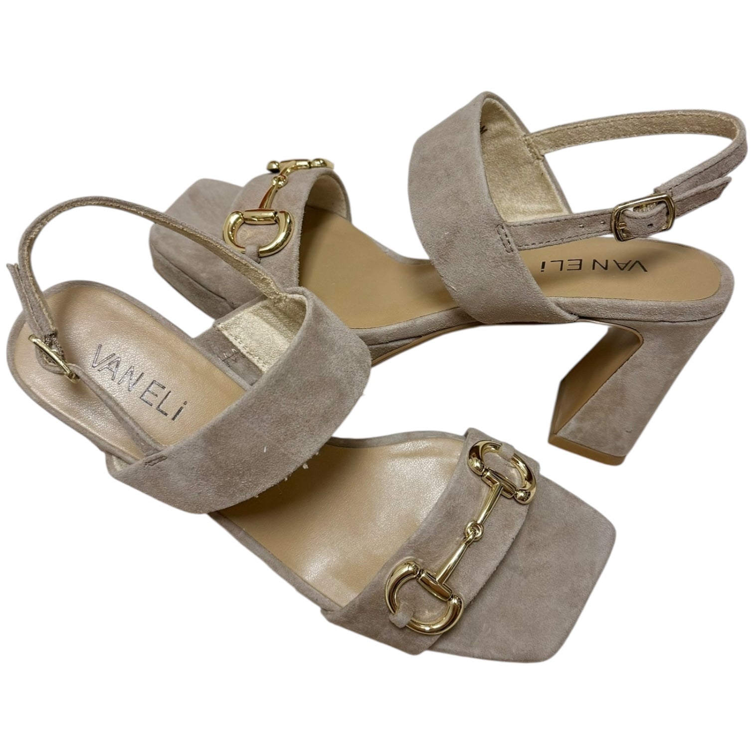 Truffle suede, platform block heel dressy causal sandal by Vaneli. Has a gold ornament at the front. Fitting most true to size. If in between, we recommend sizing up. Also available in store!