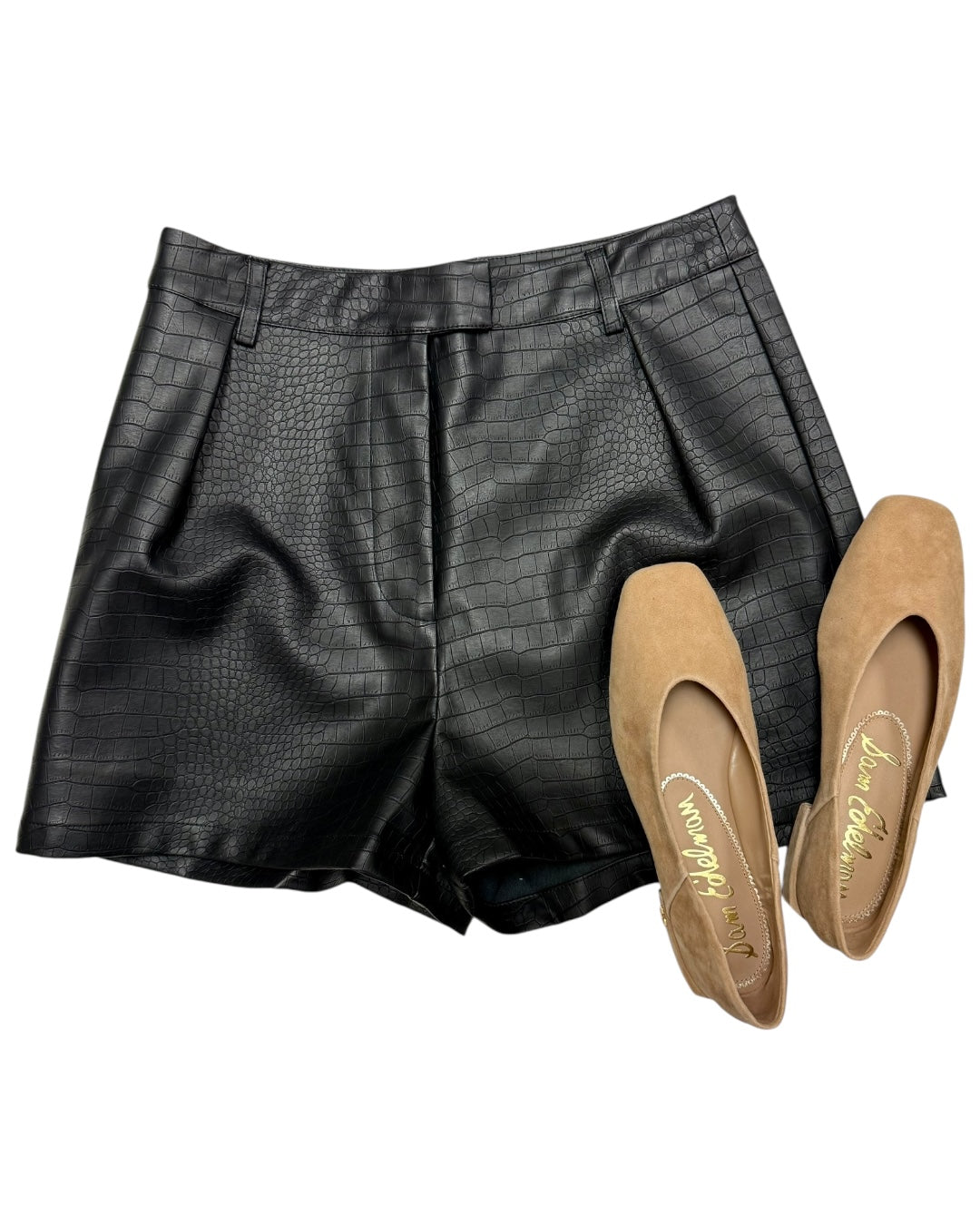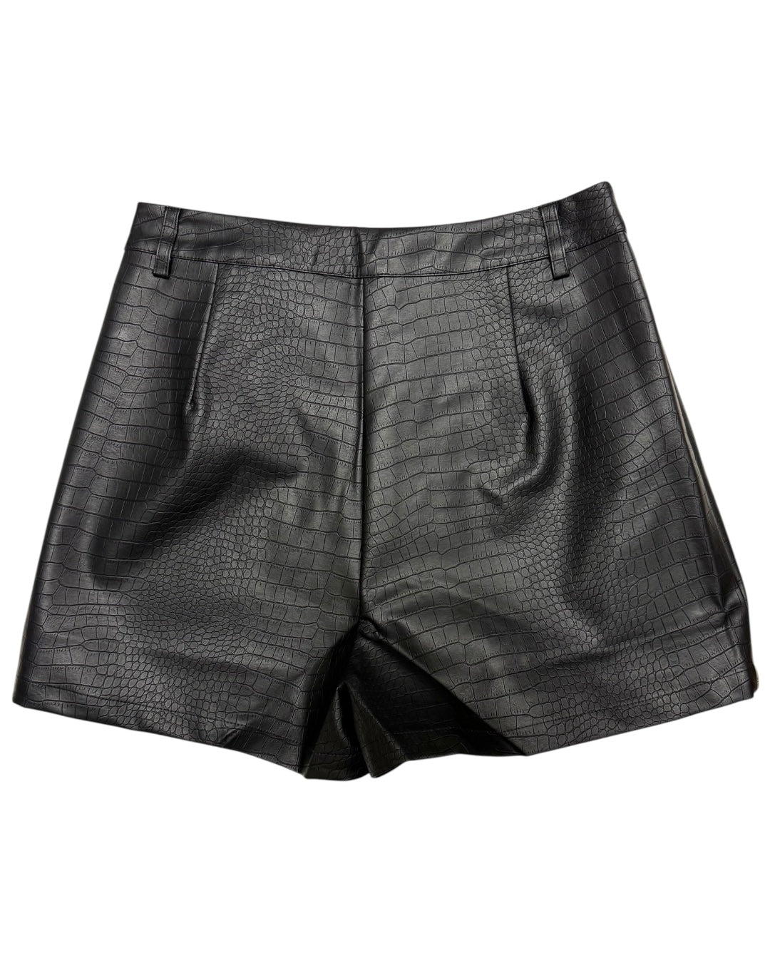 Faux leather, croc printed zip up short. Has belt loops. Fitting slightly big, size down if in between. Also available in store!