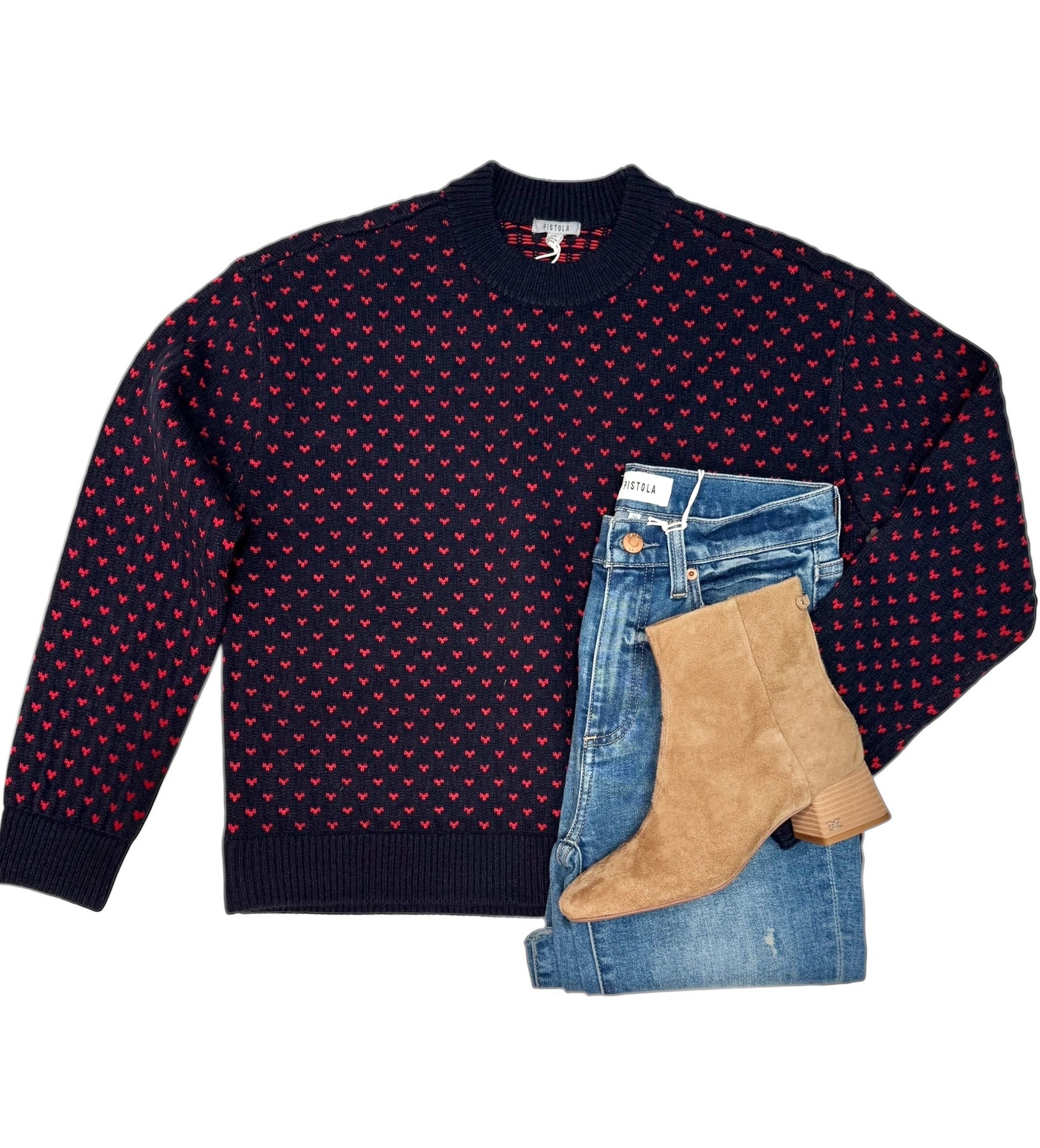 This navy knit sweater features a subtle red deer pattern throughout, giving it just the right pop of playful detail. Designed with a relaxed fit and ribbed trim. Also available in-store.
