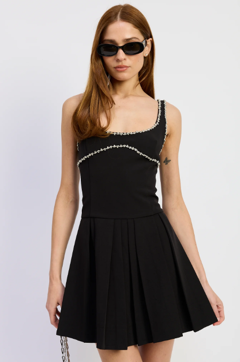 Pleated Corset Pinafore Mini Dress With Jewel Trim. Hand wash. Model is 5'9 and wearing a size S for reference.