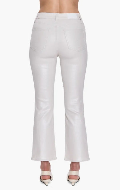 Our best-selling Lennon jean crafted in a pearly off-white finish that has a subtle shine. High rise waist and a slim fit through the hips and thighs, flaring at the calf. High stretch fabric. Silhouette offers a flattering fit for many shoe styles from heels to sneakers.