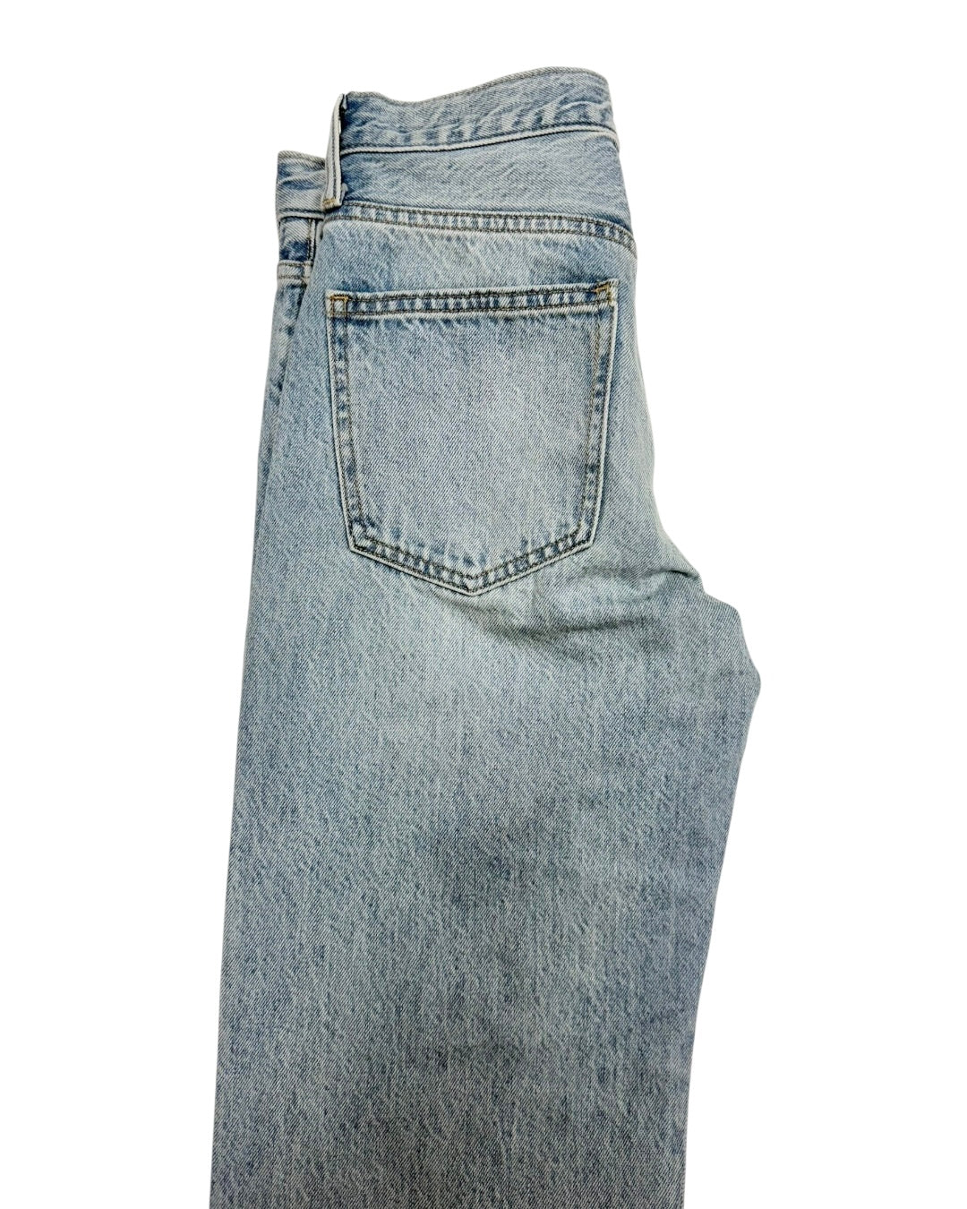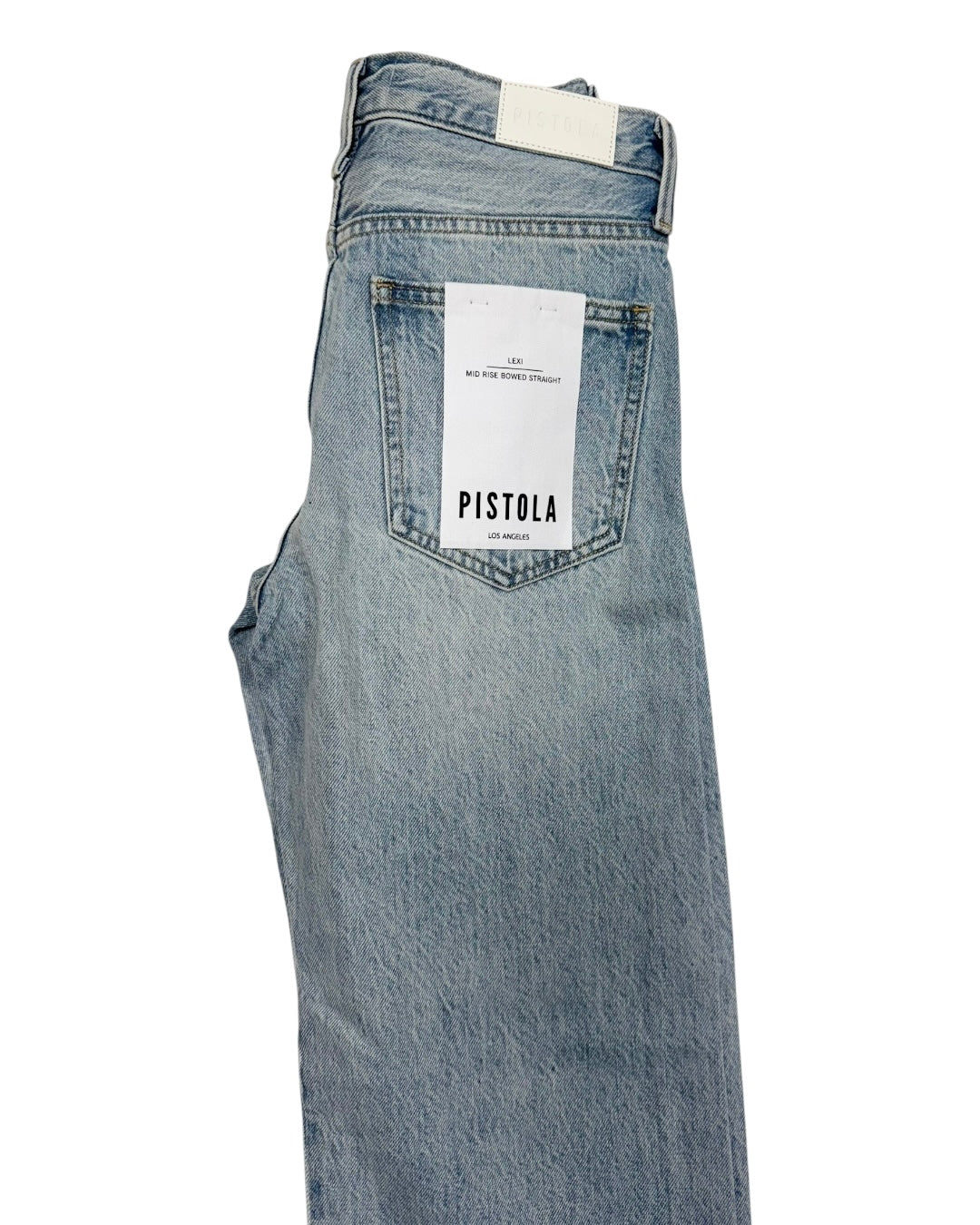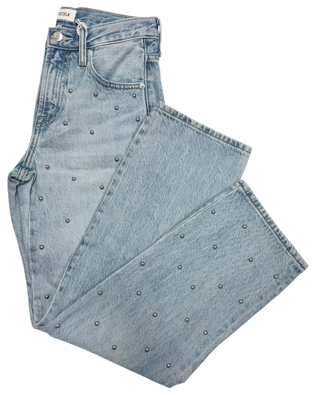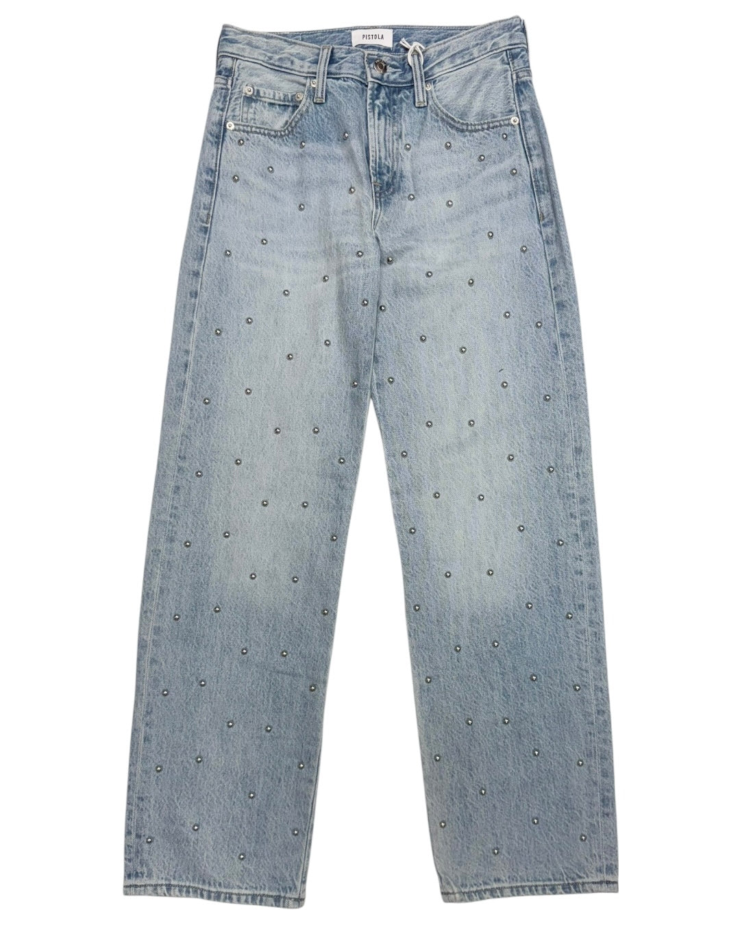 Bowed leg light washed jean by pistola. Features silver studs all throughout the front of the jean. Fitting true to size. Also available in store!