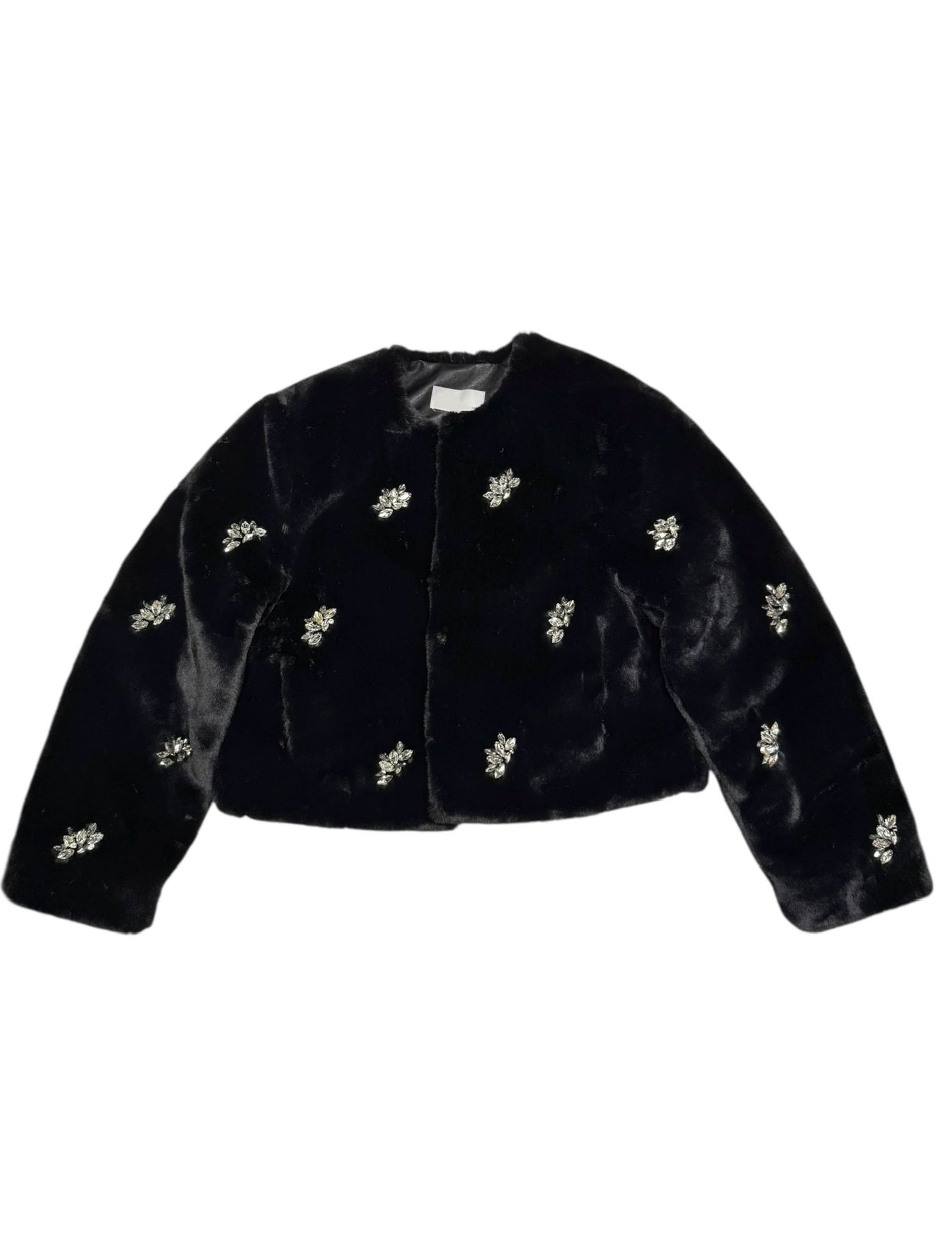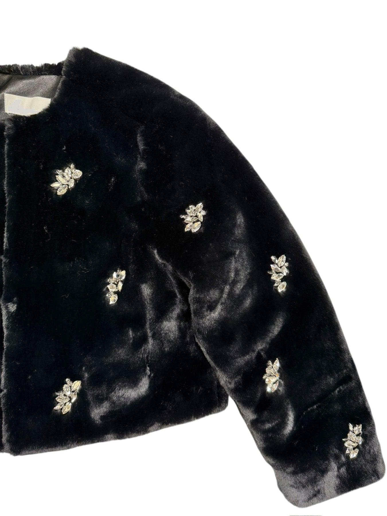 This plush faux fur jacket features crystal embellishments throughout for the perfect mix of texture and sparkle. A statement layer that instantly elevates any outfit. Hook-and-eye closure. Also available in-store