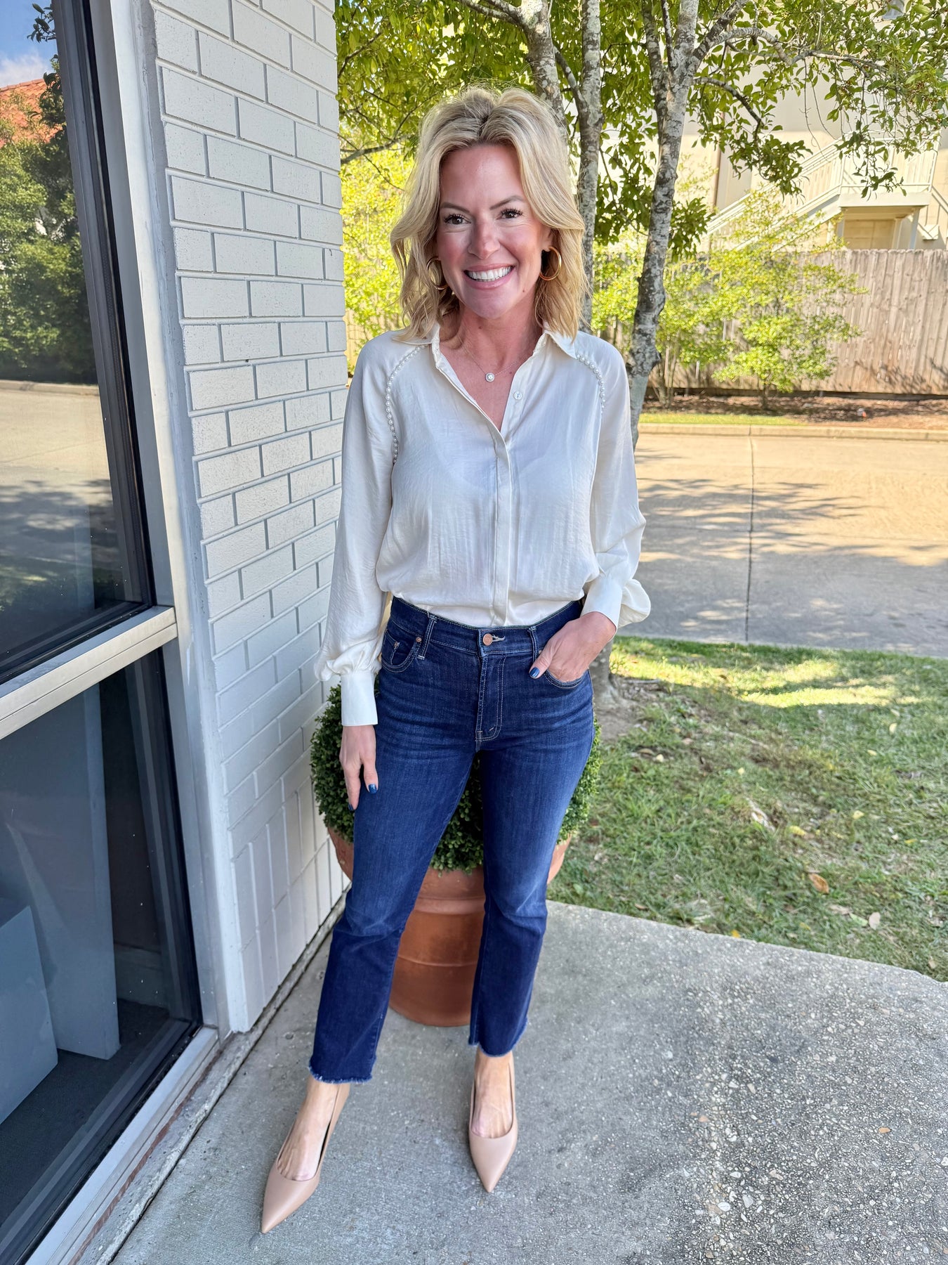 This silky blouse features delicate pearl trim along the shoulders and a relaxed fit that drapes beautifully. Also, available in-store.