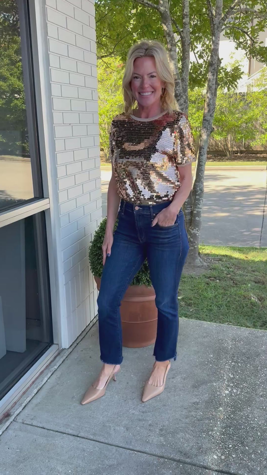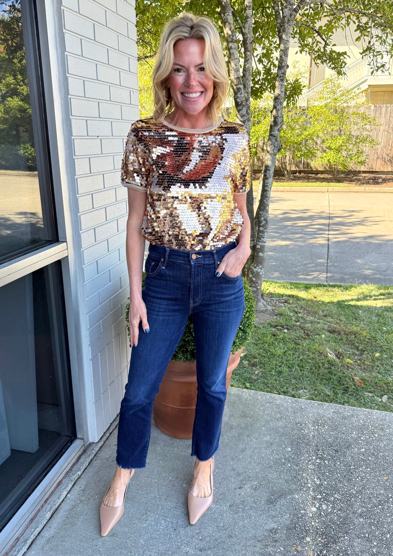 Make an entrance in this show-stopping gold sequin top. The classic short sleeve silhouette and full sequin coverage make it perfect for holiday parties, concerts, or a night out. Also, available in-store