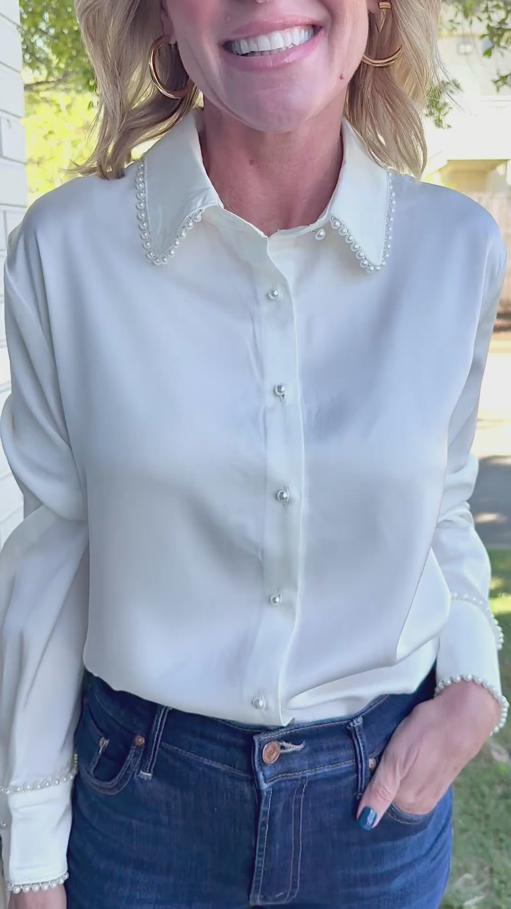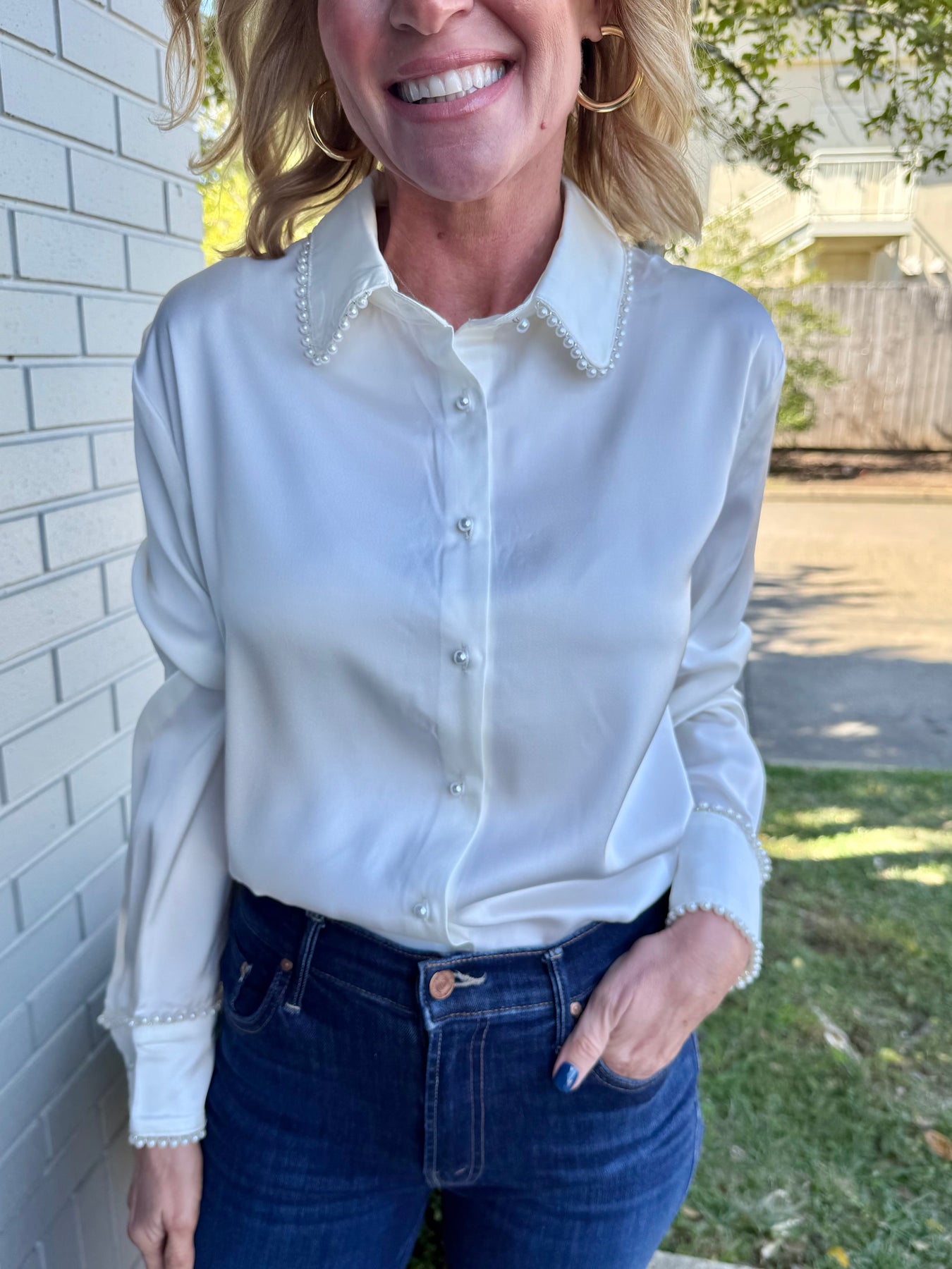 White satin blouse featuring pearl embellishments along collar and sleeve cuffs. Also available, in-store