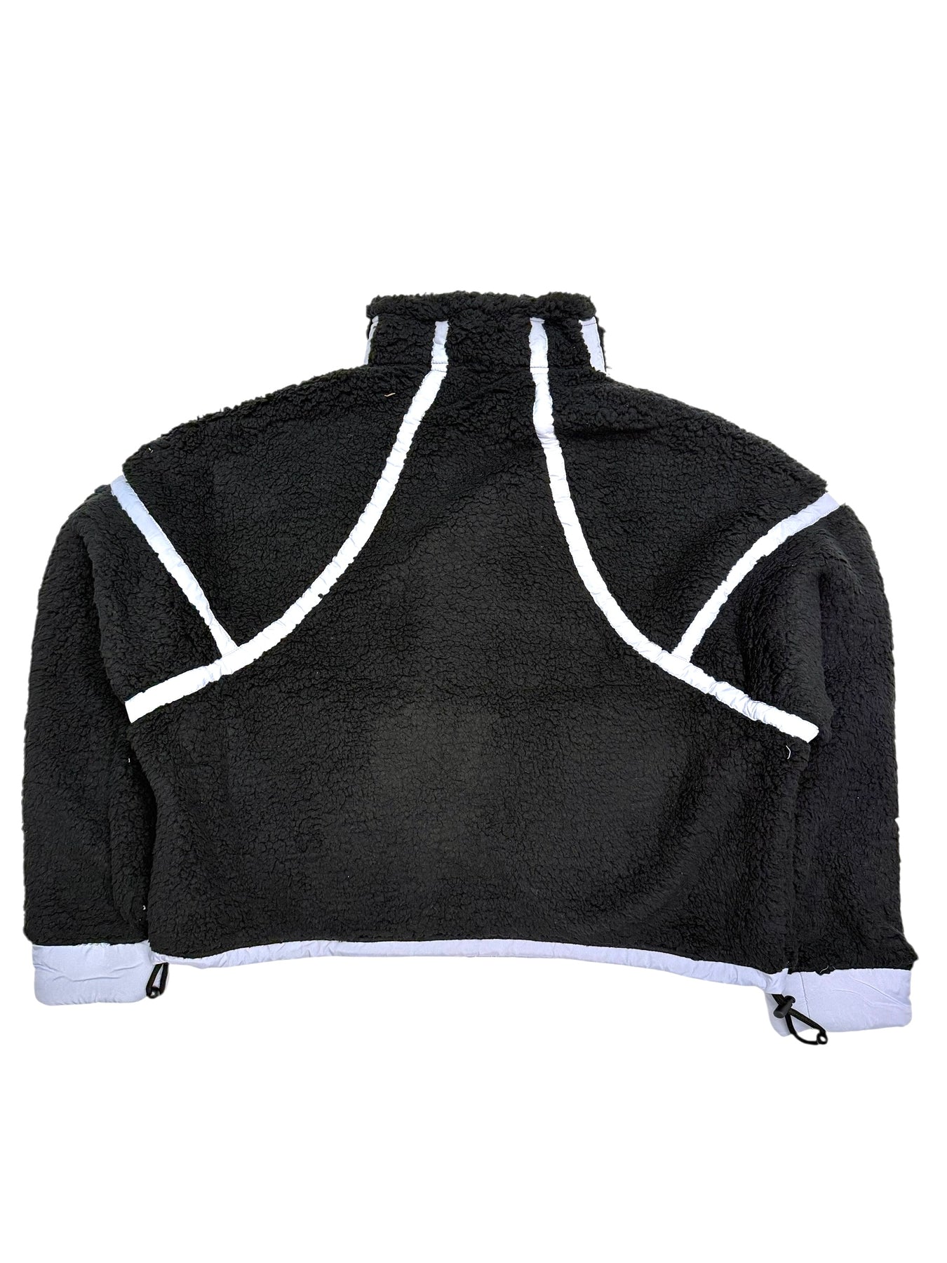 A cozy sherpa zip-up jacket in a navy-black hue with light blue periwinkle trim. Designed with front zip pockets, and an adjustable drawstring hem for a customizable fit. Perfect for layering on casual days or weekend errands. Also, available in-store