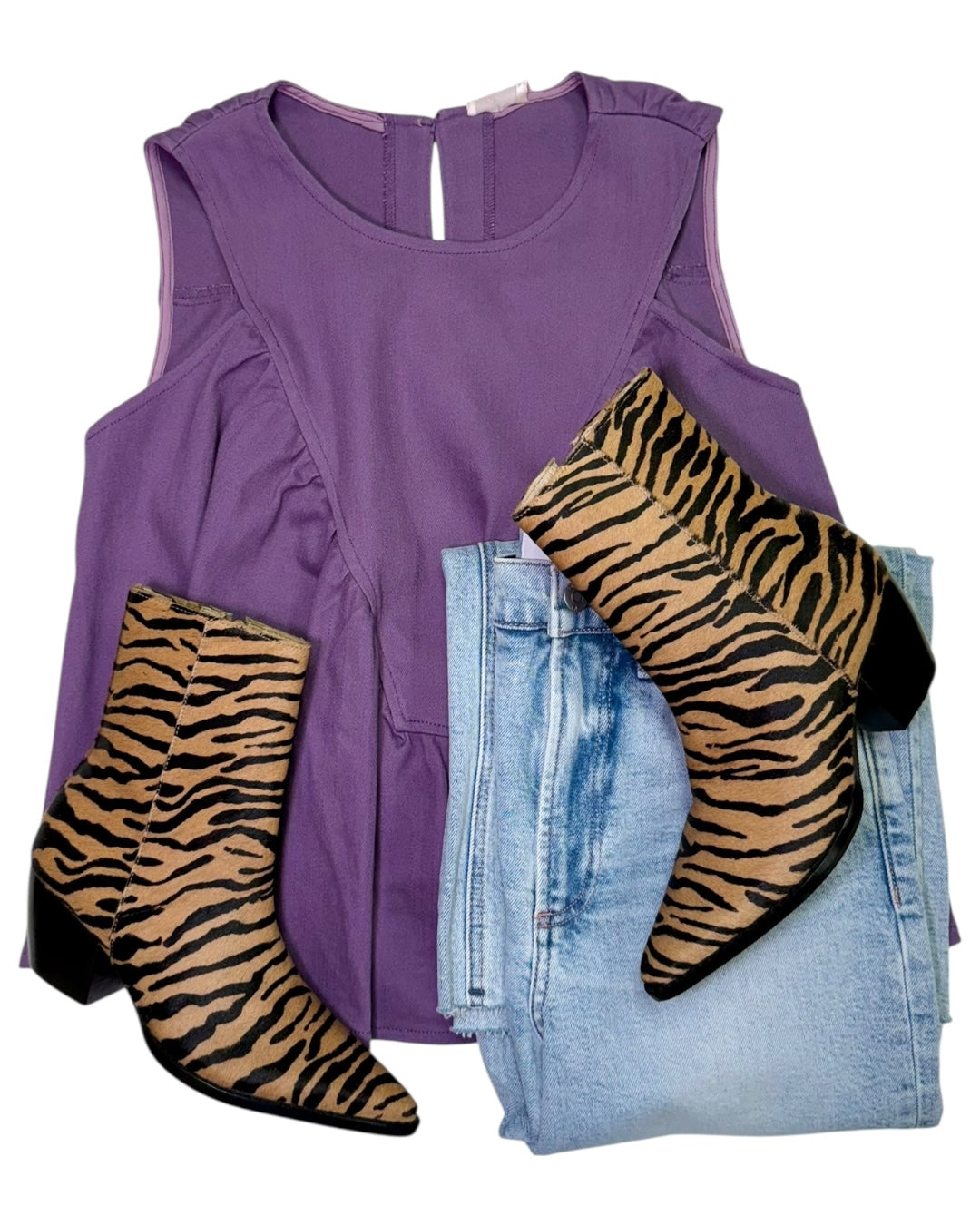 Purple, sleeveless peplum denim top. Fitting true to size. Also available in store!