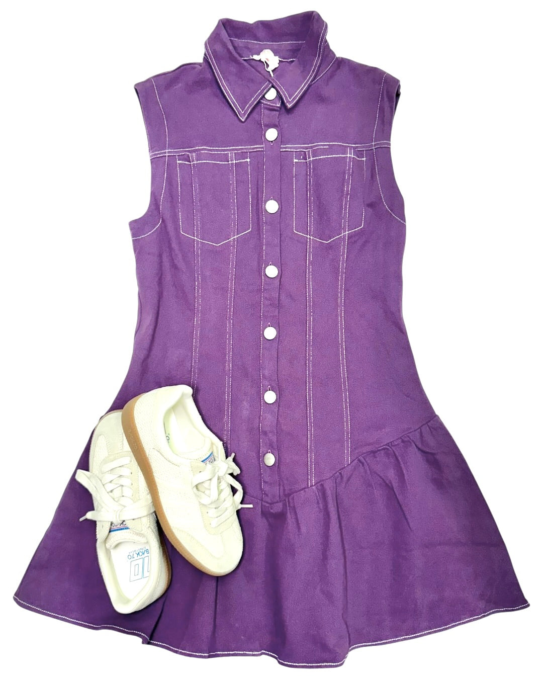 Sleeveless, purple denim mini dress with buttons down the front and a fit and flare style. Has built in shorts!! Fitting true to size. Also available in store!