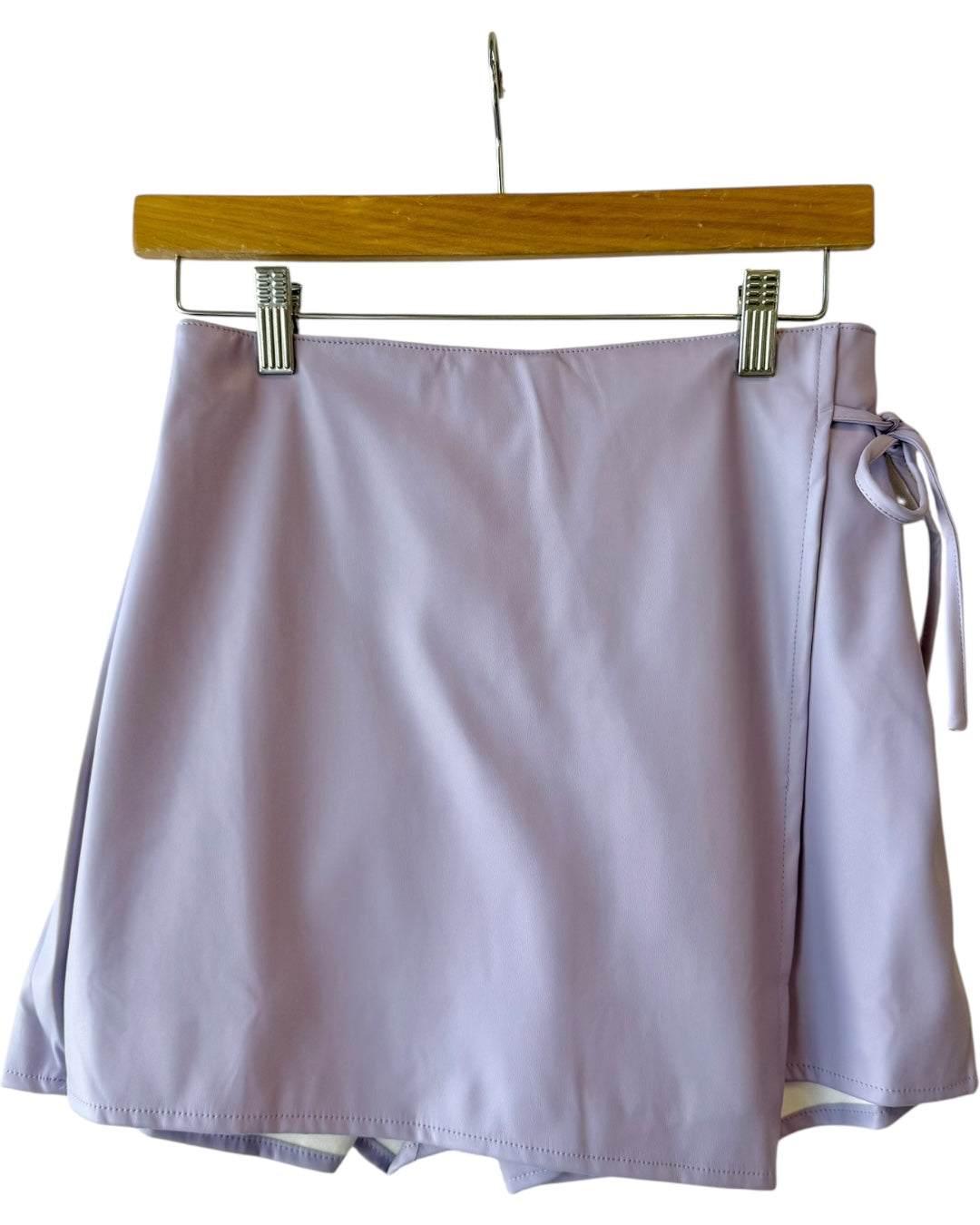 Light purple, pleather tie wrap mini skort. 60% polyester and 40% PU. Fitting true to size. Also available in store!