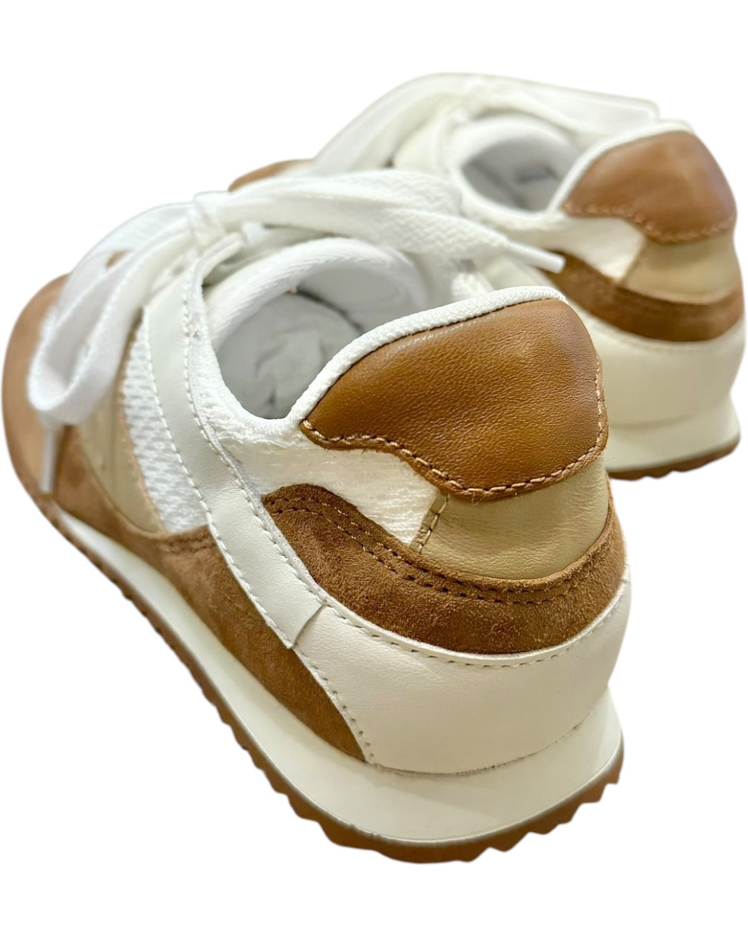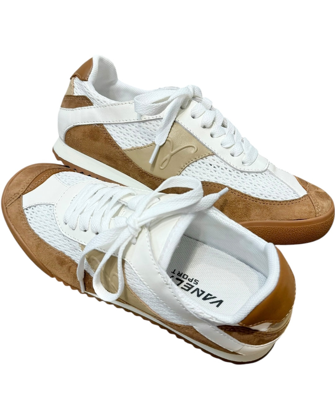 Brown suede, camel leather and white knit lace up sneaker by Vaneli. Fitting slightly small. Size up if in between! Also available in store.