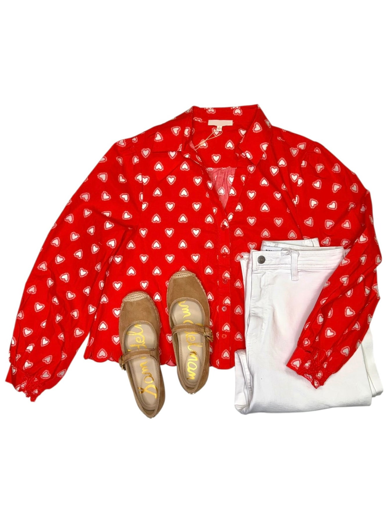 Cropped shirt featuring a charming heart print and a delicate scalloped hem. Also, available in-store.