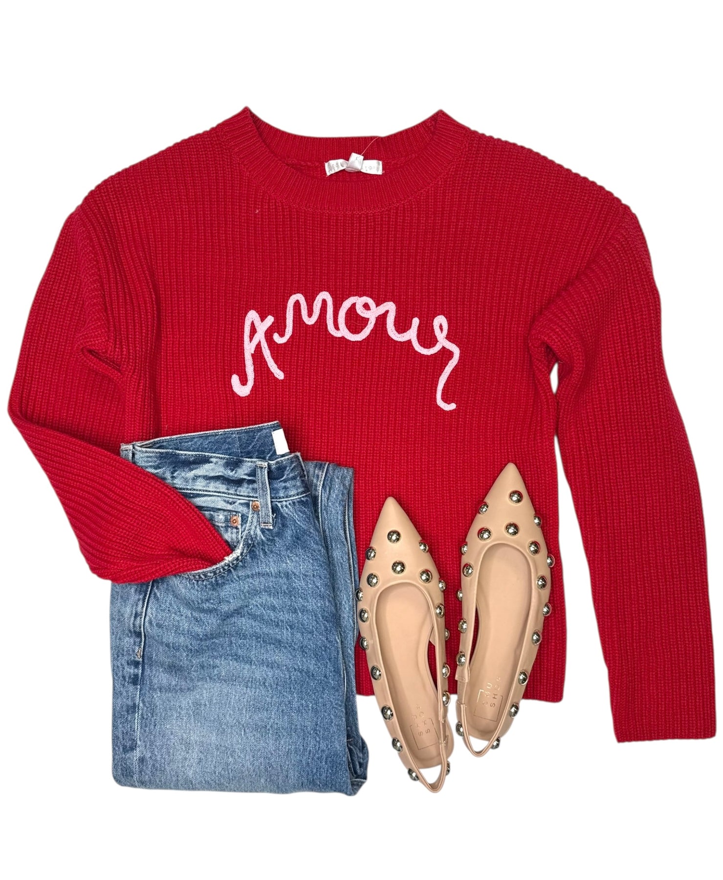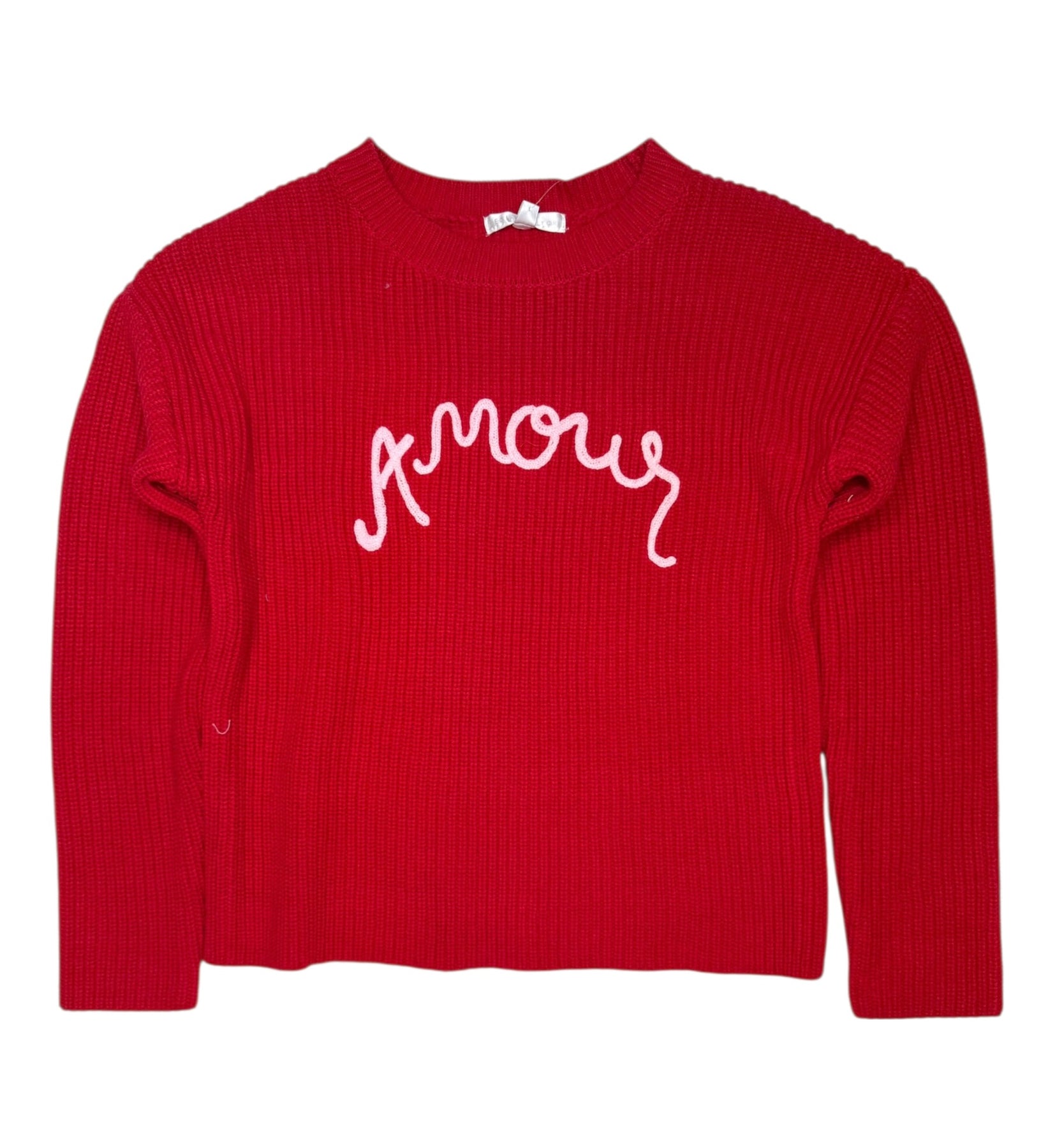 Red knit sweater designed with 'Amour" in pink cursive along chest. Perfect for a subtle Valentine's look. Also, available in-store.