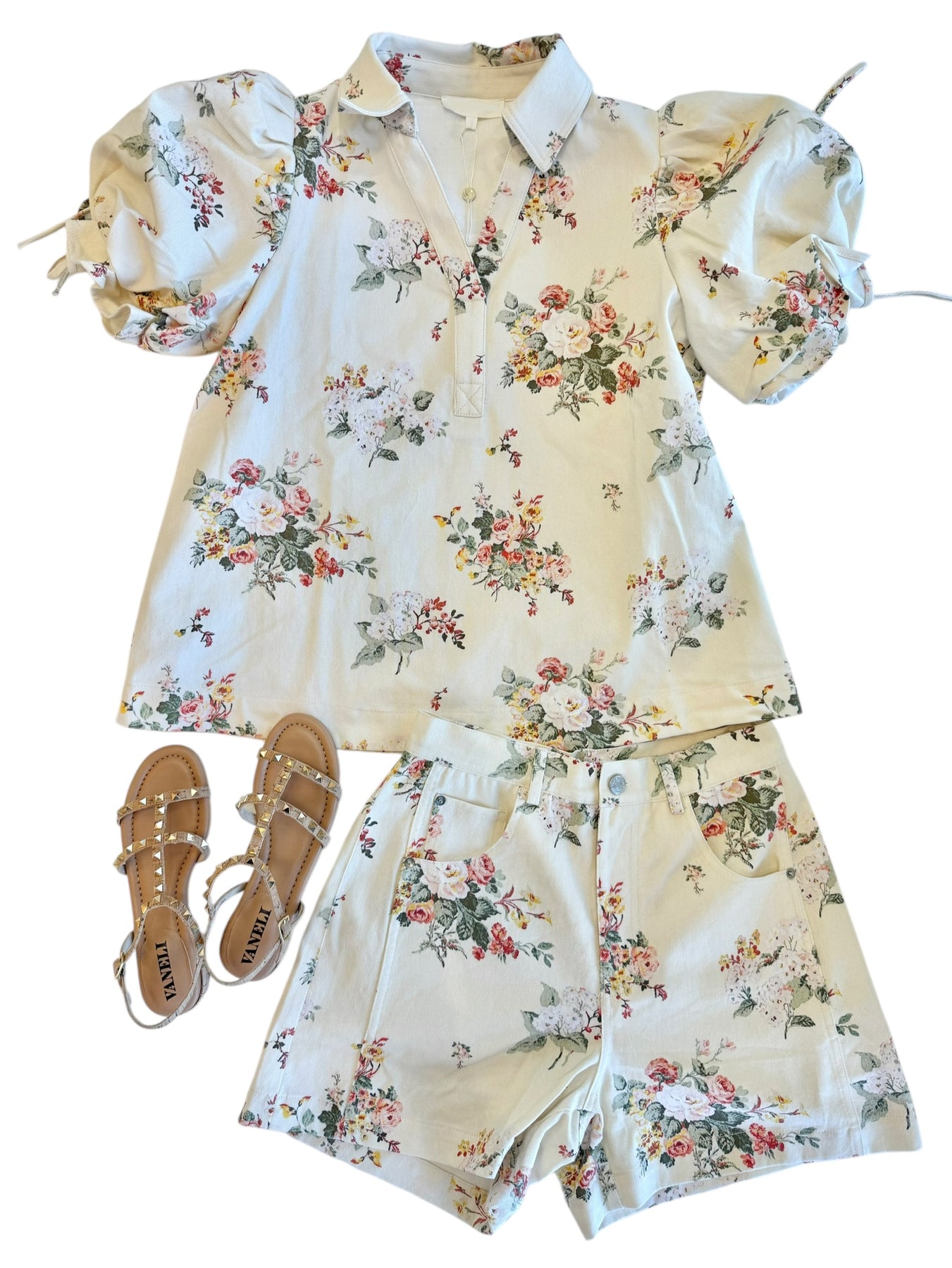 Cream denim top with a green, orange, and pink floral pattern featuring cinched tie sleeves. Pair with the Lisbet shorts or by itself. Also, available in-store.