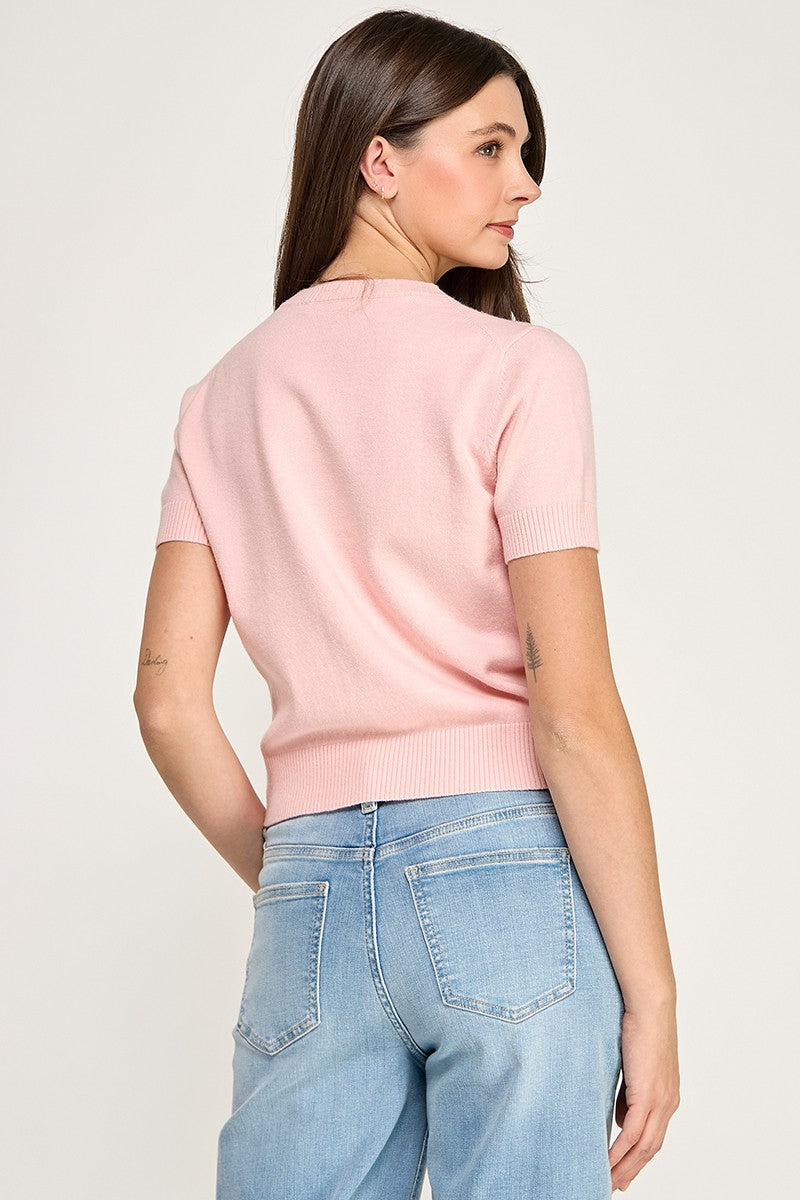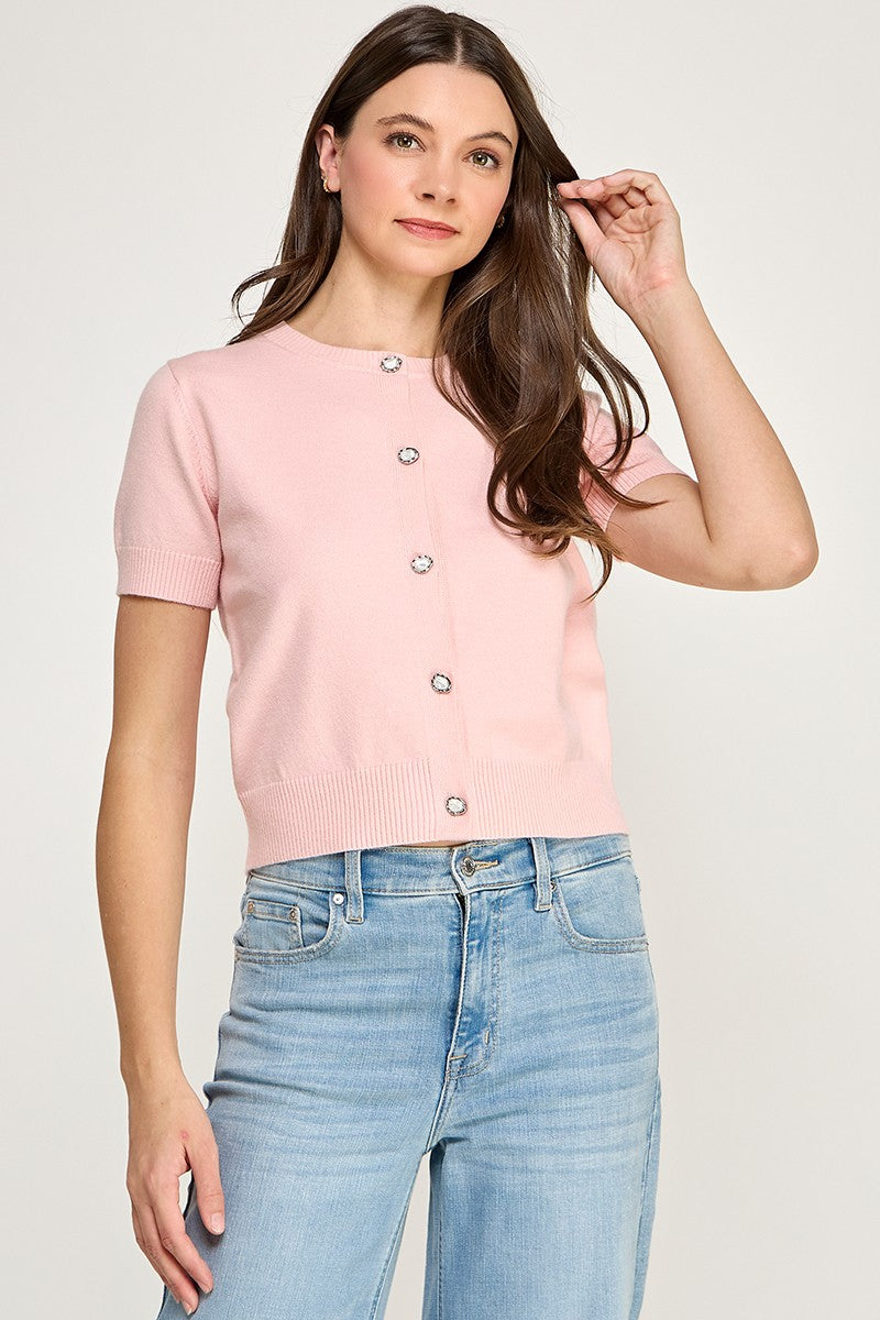 Pink short sleeve cardigan with irregular shaped pearl buttons all the way down the front. Also, available in-store!