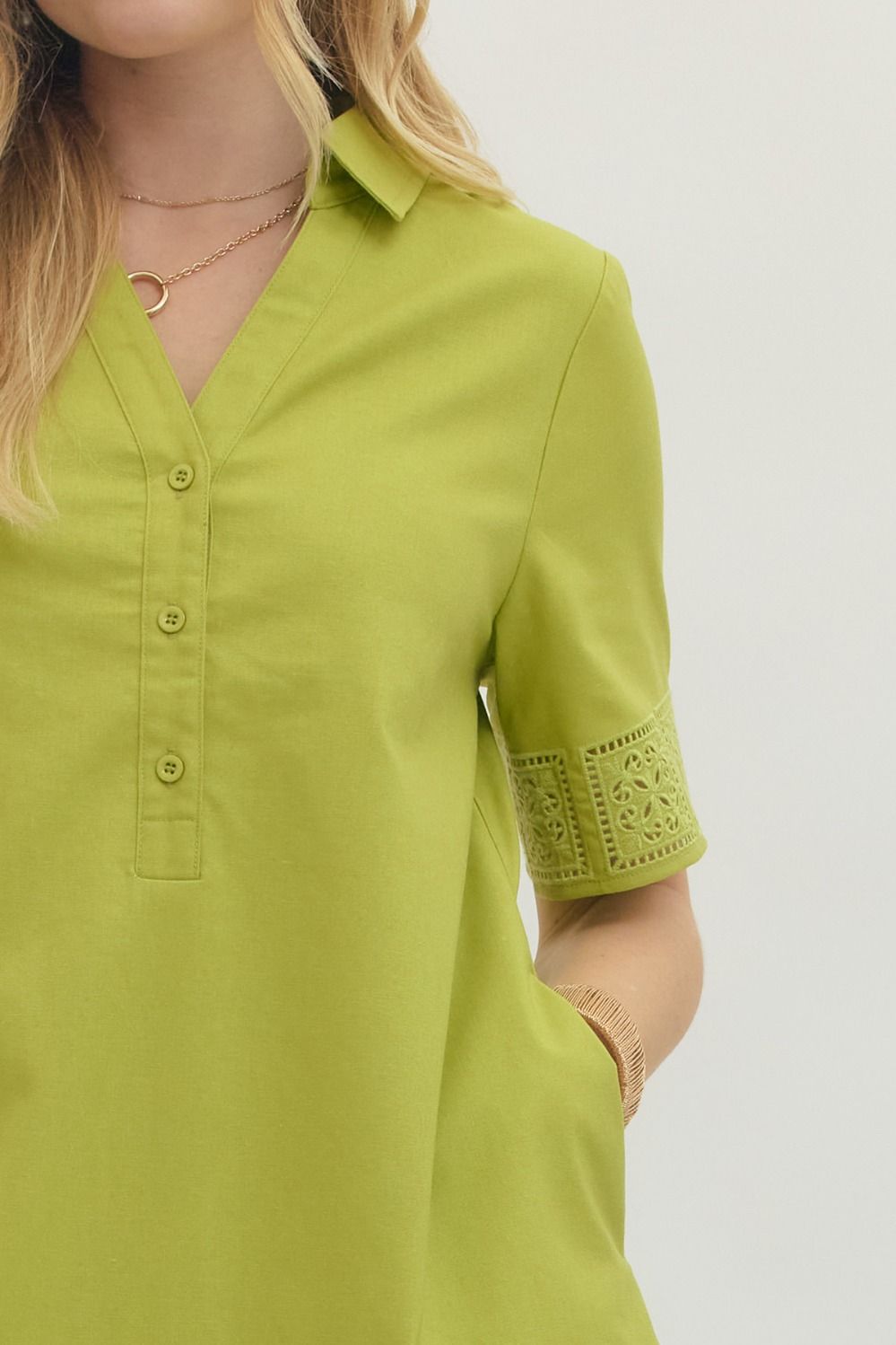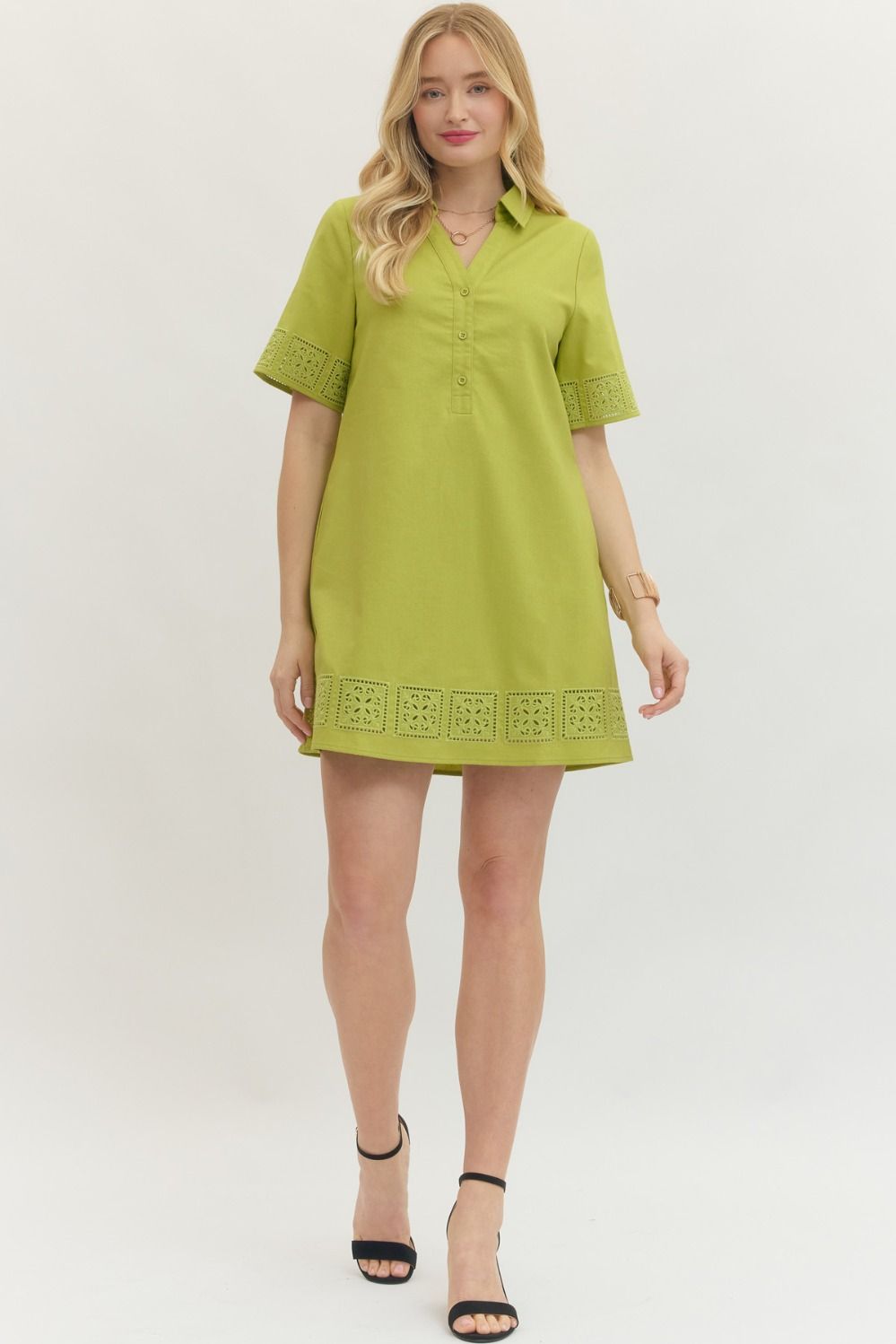 Solid short sleeve mini dress featuring eyelet cutwork trim. Button closure at front. Side pockets. Lined. Woven. Non-sheer. Lightweight. Also, available in-store