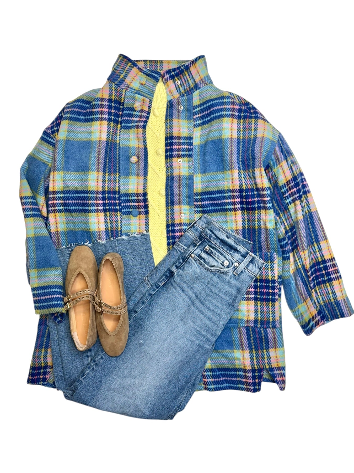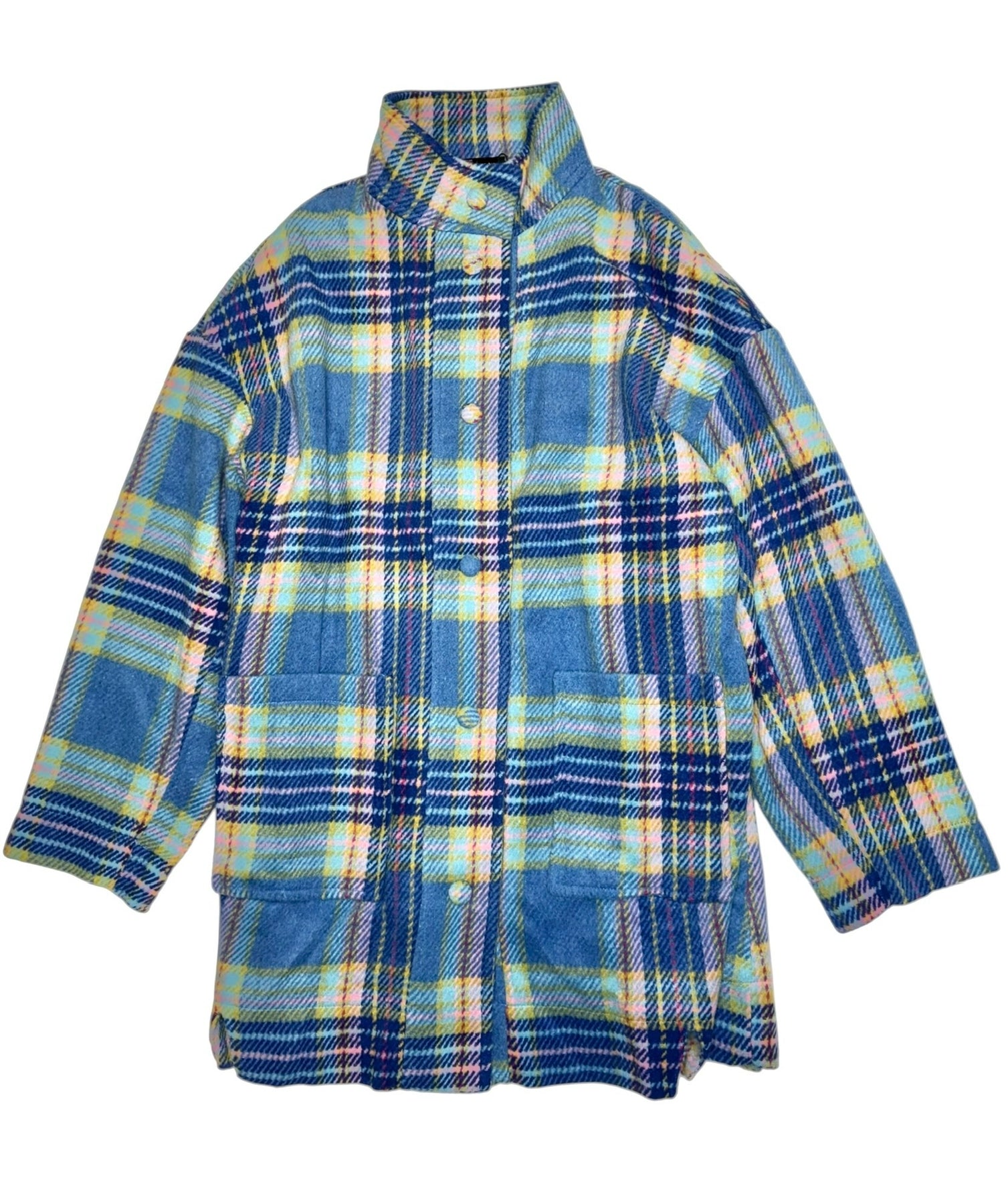 Multicolored plat coat with snap button closesure and blue satin inside.