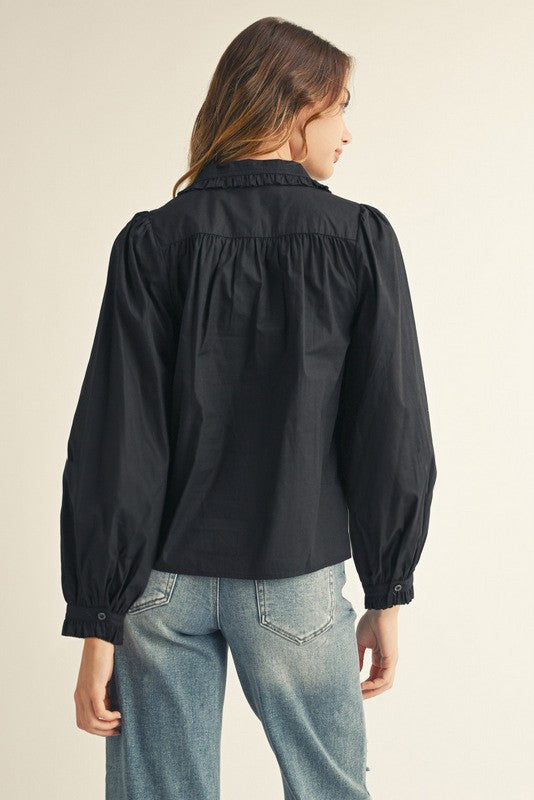 Ruffle cuffed long sleeves button down shirt, ruffle detail collared. Also, available in-store.