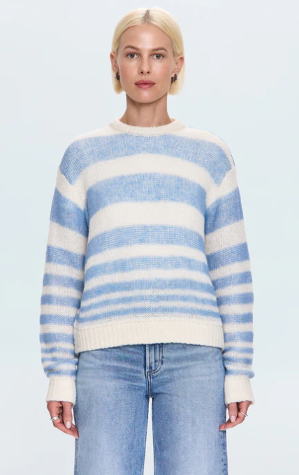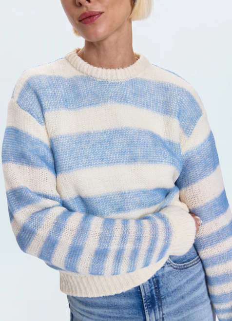 Playful meets polished in the Moa Sweater. Designed with a relaxed crew neckline and tactile bubble-knit texture, it blends cozy comfort with refined ease. The soft structure adds dimension, making it an effortless choice for layering or standing alone. Blue Gradient Stripe introduces a fresh tonal mix—cool, airy, and quietly striking.