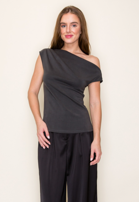 Brushed modal scuba drap one shoulder top. Also, available in-store.