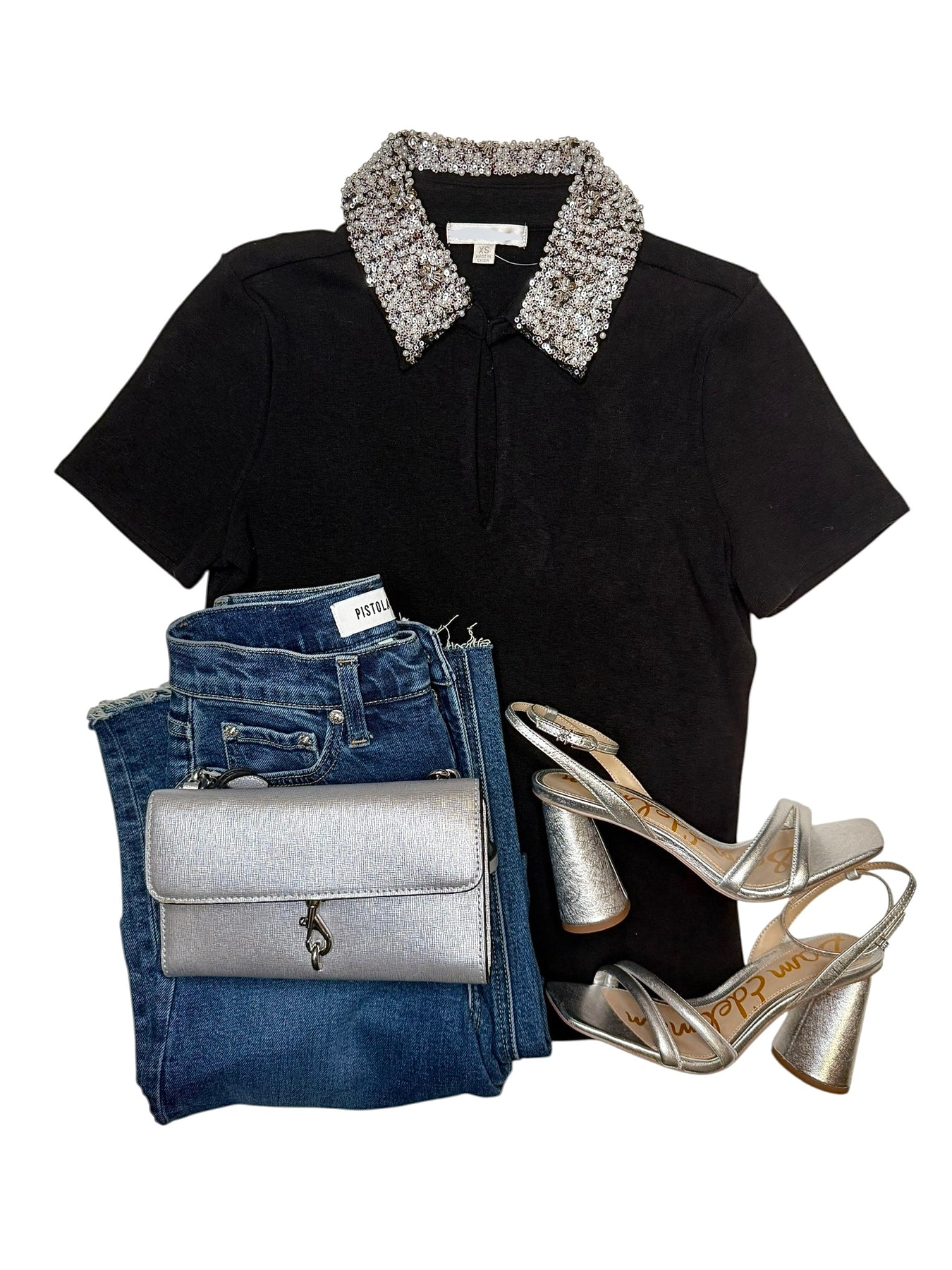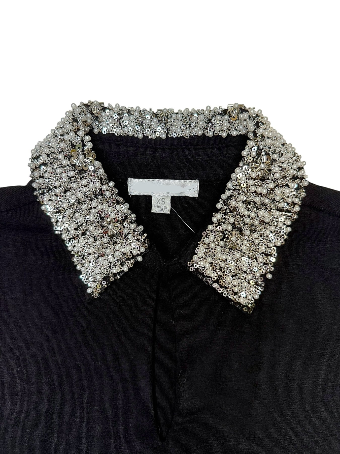 Black short sleeve collard knit top feautring pearl and jewled embellishments along the collar. Also, available in-store.