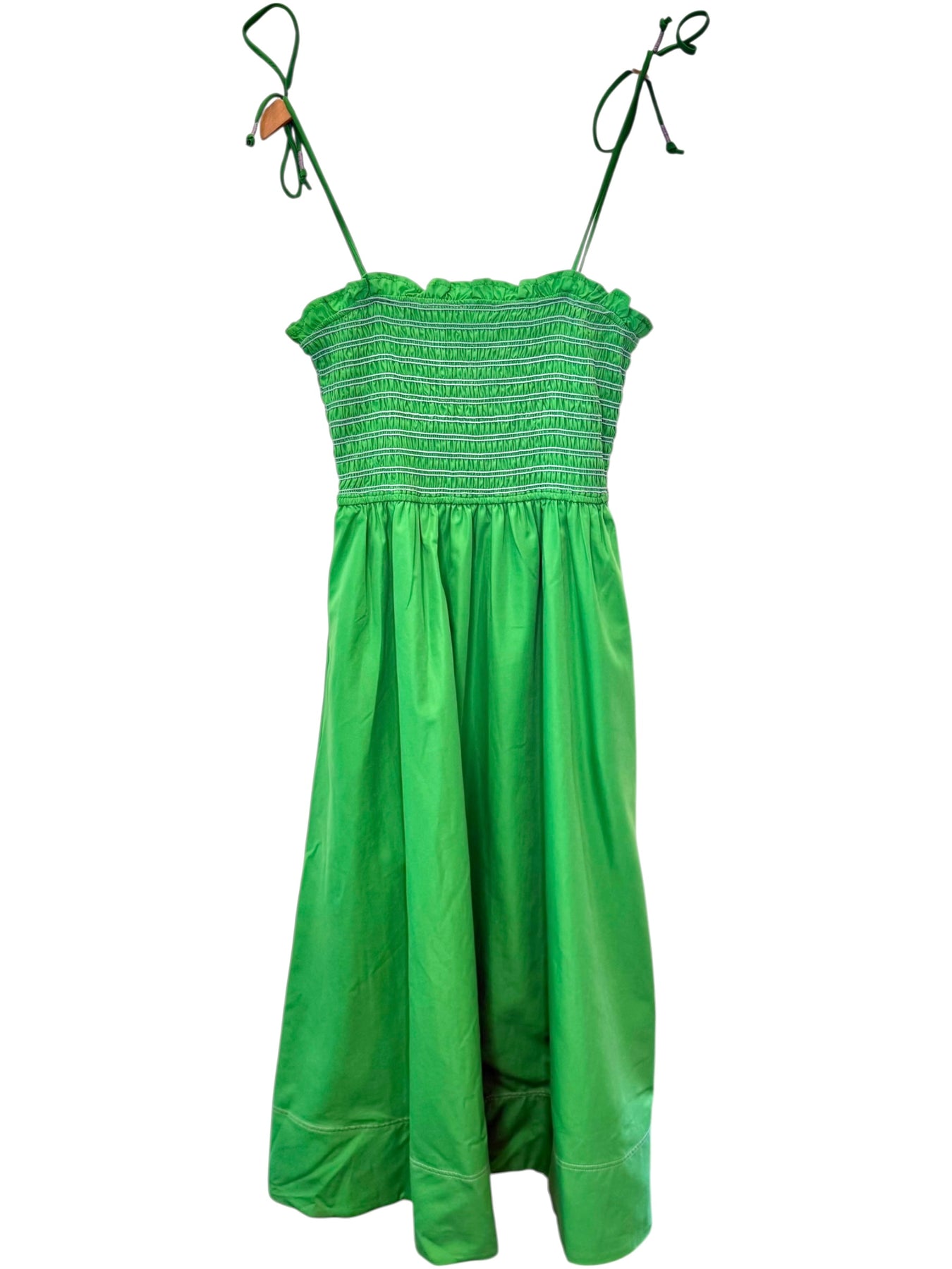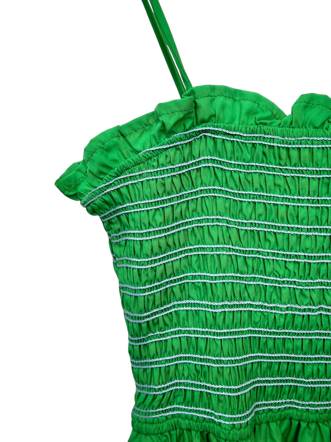 Green spaghetti strap dress with a smocked bodice featuring blue contrast threading. Also available in-store.
