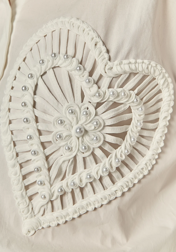 Drop shoulder, long sleeve with hidden button down closure. Featuring a pearl heart detail for a fun twist on a classic.